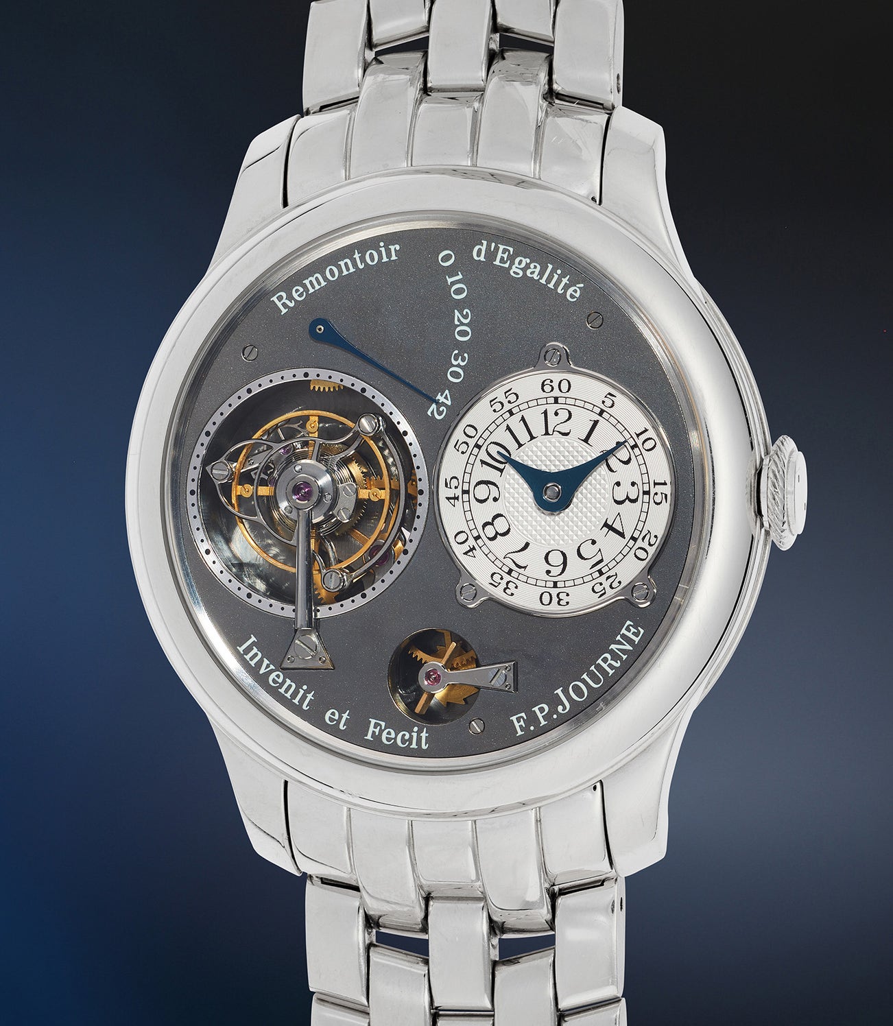 An elegant and extraordinary platinum tourbillon wristwatch with power reserve display, remontoire d’egalité, ruthenium dial, and ruthenium-coated movement, and platinum bracelet, numbered 47/99-01T