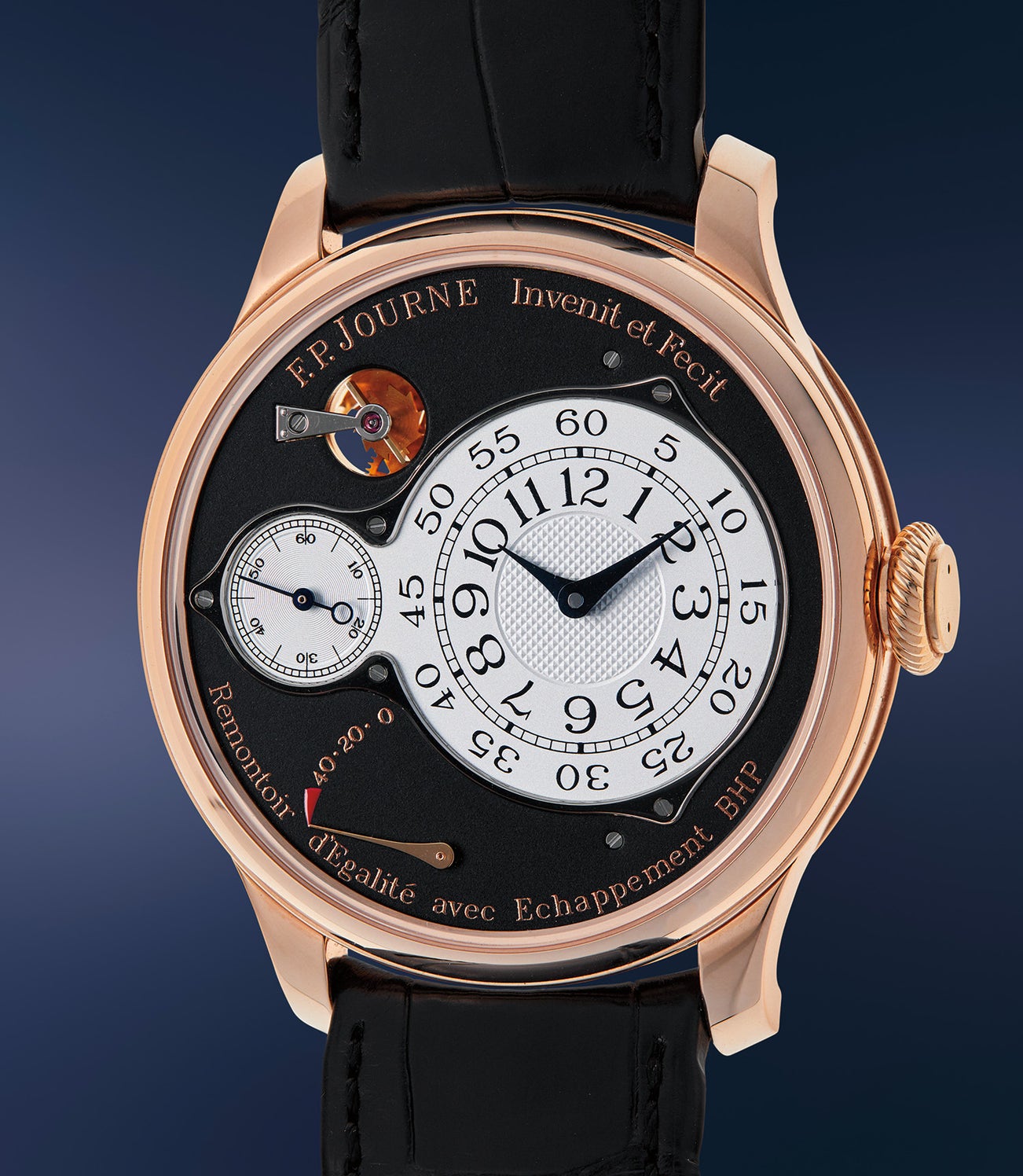 The solid 18 karat pink gold movement features a patented ‘EBHP’ direct impulse escapement with a bi-axial design, and remontoire for accuracy and constant force. The movement functions without lubrication, and the two escape wheels allow for lower impact during the transfer of energy, which over time ensures more reliability and less wear. The rementoir d'egalité system is made from lightweight titanium and connected to the additional dead-beat seconds indicator displayed on the backside of the movement. The movement is capable of 70-hours of power reserve when fully wound, with 50 hours possible without loss of amplitude.