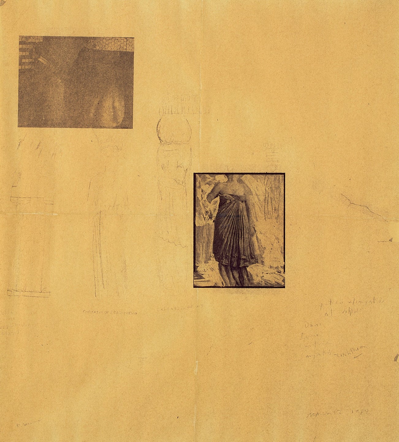 Portico with Caryatids of Delphi combines photographic images with drawing and handwritten text and relates directly to Francesca Woodman’s Temple Project. This project consisted of a series of large-scale studies of draped models, referencing caryatid figures in classical architecture, and was first exhibited in 1980 at The Alternative Museum in New York City. While Woodman’s images in that exhibition were monumental in scale, the smaller, more intimate work offered here presents insight into her creative process.