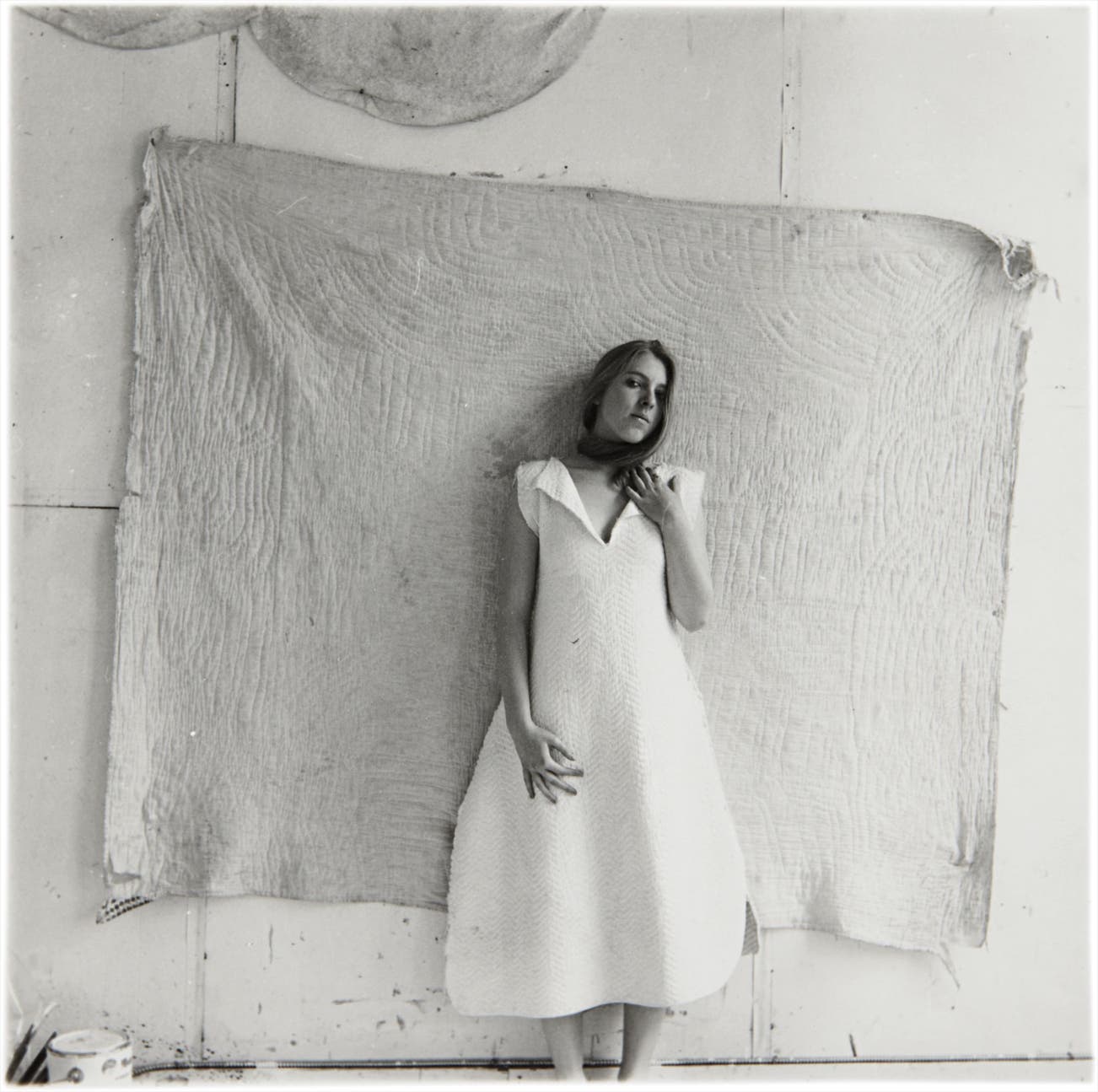 The photographs that Woodman made in Providence while a student at the Rhode Island School of Design illustrate the beginnings of the many ideas and practices that she would more fully realize while studying abroad in Rome in 1977-1978. While the present lot offers one of the most straight forward self-portraits that we have of Woodman- it also alludes to her interest in the transient nature of the figure in space. Here, the mimicking of the fabric on her dress and on the wall behind her create a sense that her body is caught between two planes- neither in the foreground nor the background but hovering in the space between. This is a visual concept that she will take even further in her later works as her nude figure literally fades against the textured walls of her surroundings.