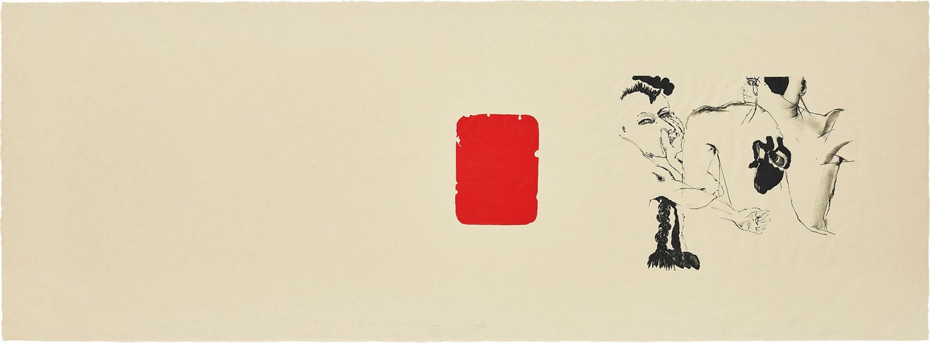 Unique lithograph in black and red, on Okawara paper, with full margins.