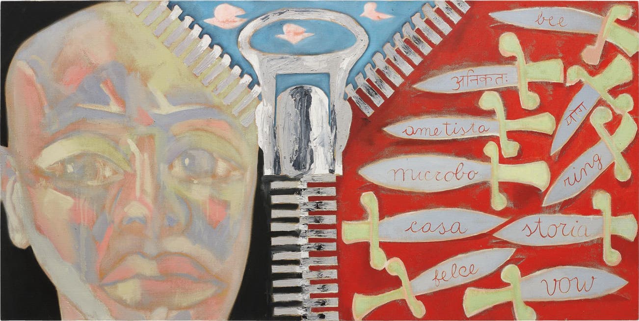 Self-portraiture has remained a constant exploration throughout Clemente’s oeuvre in tandem with the notion of identity. Expressing a dream-like quality that straddles the surrealistic borders of psychological and mystical settings. The gulf between the corporeal and the psychological realms is emphasized in Zip. The horizontalality of the canvas is divided into three areas by a large zipper: the leftmost area depicting the artist gazing off to the side, his wide eyes revealing streams of tears; the rightmost area of the canvas revealing daggers brandished with evocative text; while the central area suggests the calmness of flight and freedom under an expanse of clear blue sky. In Clemente’s Zip, the complexity of internal dialogue is rendered through the fragmented composition, where symbolism and self are both bound together and liberated by moving mechanism.