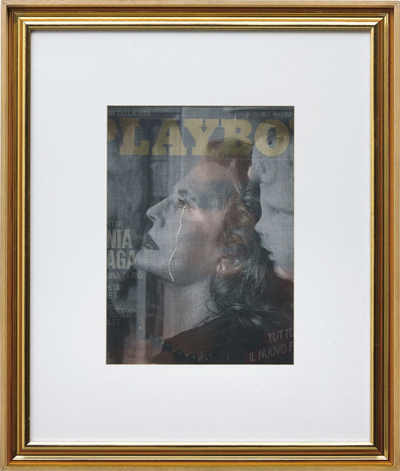 colour laserprint on canvas with metallic embroidery in artist's frame