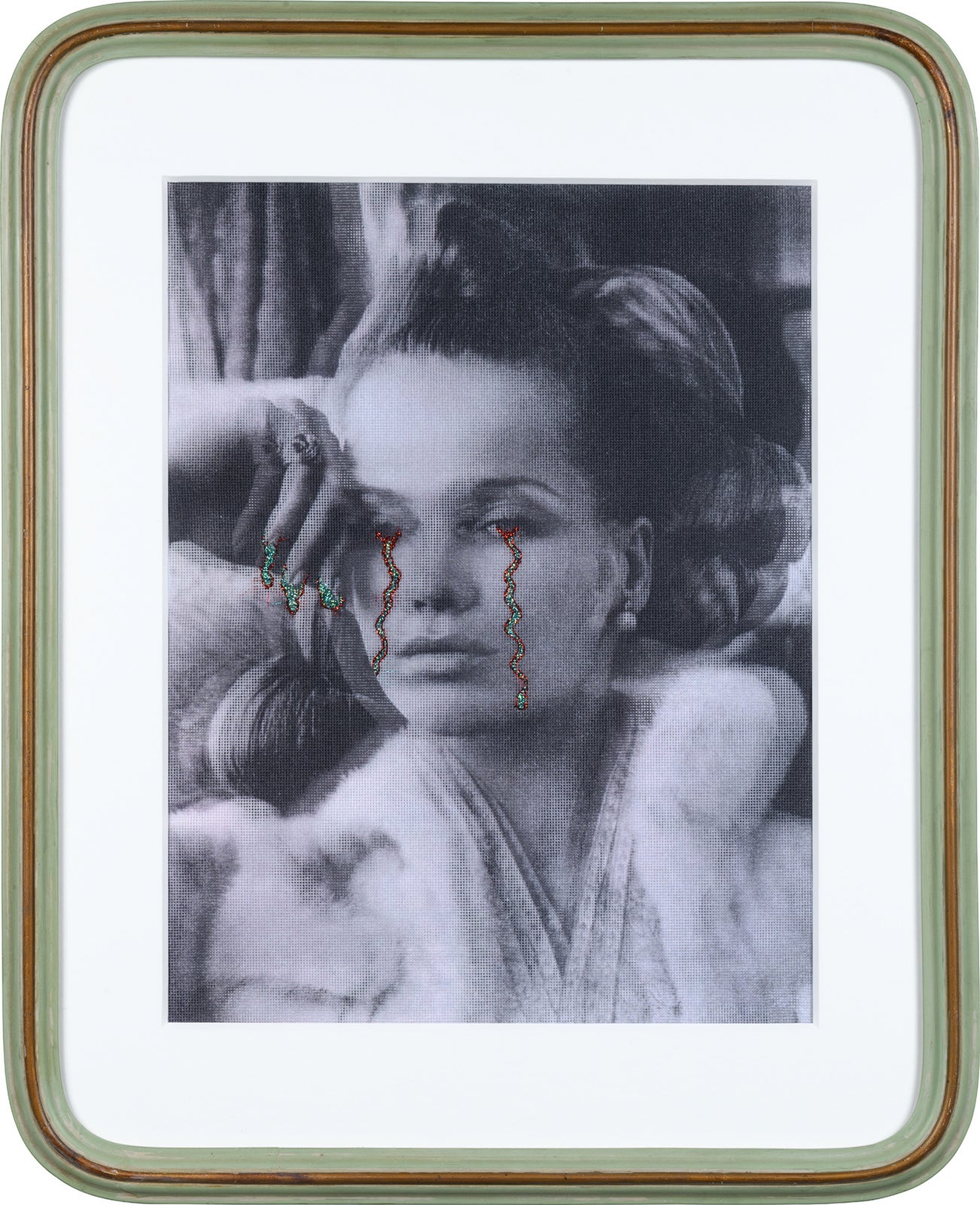 color laser print on canvas with metallic embroidery, in artist's frame