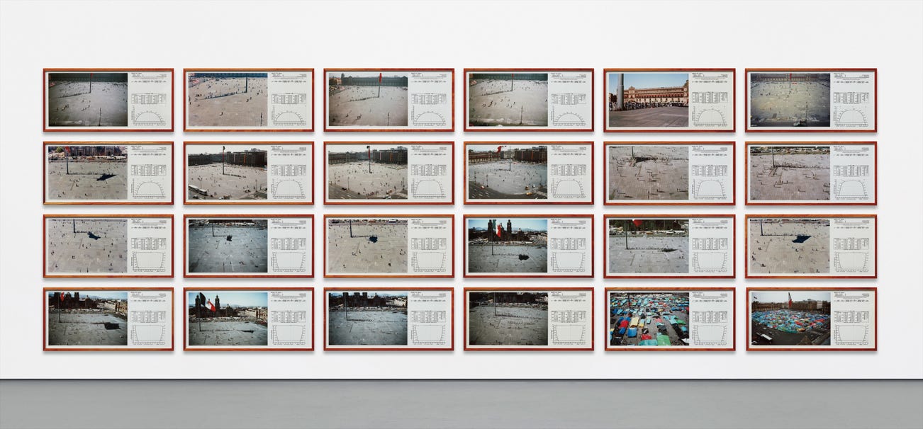Alÿs realized that his work is a product of the interaction between reality and its record. This interaction is exemplified in the present lot, Sunpath, Mexico City (1999), an exceptional installation and the only intact edition of the complete 24 photographs composing the project, juxtaposed with sunpath diagrams. In each photograph, a shadow is cast from the towering central flagpole that displays the Mexican national flag, with people gathering in the shadow. Recalling a sundial, Sunpath, Mexico City meticulously documents the hustle and bustle of any normal day, between eleven o’clock in the morning and six o’clock in the afternoon, when the square is at its busiest. Yet bystanders are not simply taking refuge from the sun, but also 'provoking a sculptural situation, through social encounter' (Francis Alÿs and Cuauhtémoc Medina, eds., Francis Alÿs: a story of deception, exh. cat., Museum of Modern Art, New York, 2010, p. 100), indirectly informing us about the different times of day. Likewise, and 'within this constant phenomenon of movement you also have moments of complete freeze' (Matthew Crookes, ed., Artspace, New Zealand, 2008, p. 11) much like movies in the 1940s and 1950s. Ultimately, Sunpath, Mexico City, attests to the conceptual complexity that Francis Alÿs produces, evincing dialogues centered on acute observation, urban explorations and engagement with quotidian life.