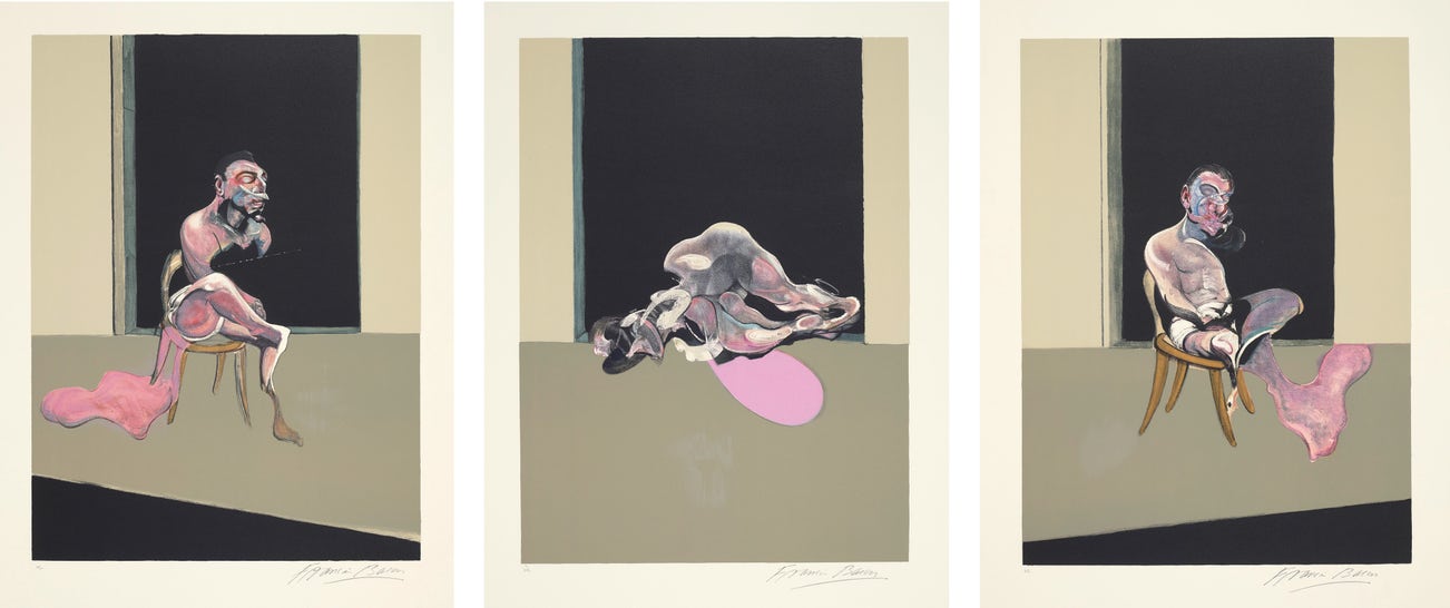 In conversation with yet challenging the conventions of Modern art, Bacon was known for his triptychs brutalizing formalist truths, particularly Three Studies for Figures at the Base of a Crucifixion, which Bacon debuted in London in 1944, and Three Studies of Lucian Freud, which became famous when it set the record for most expensive work of art at auction at the time it sold in 2013.