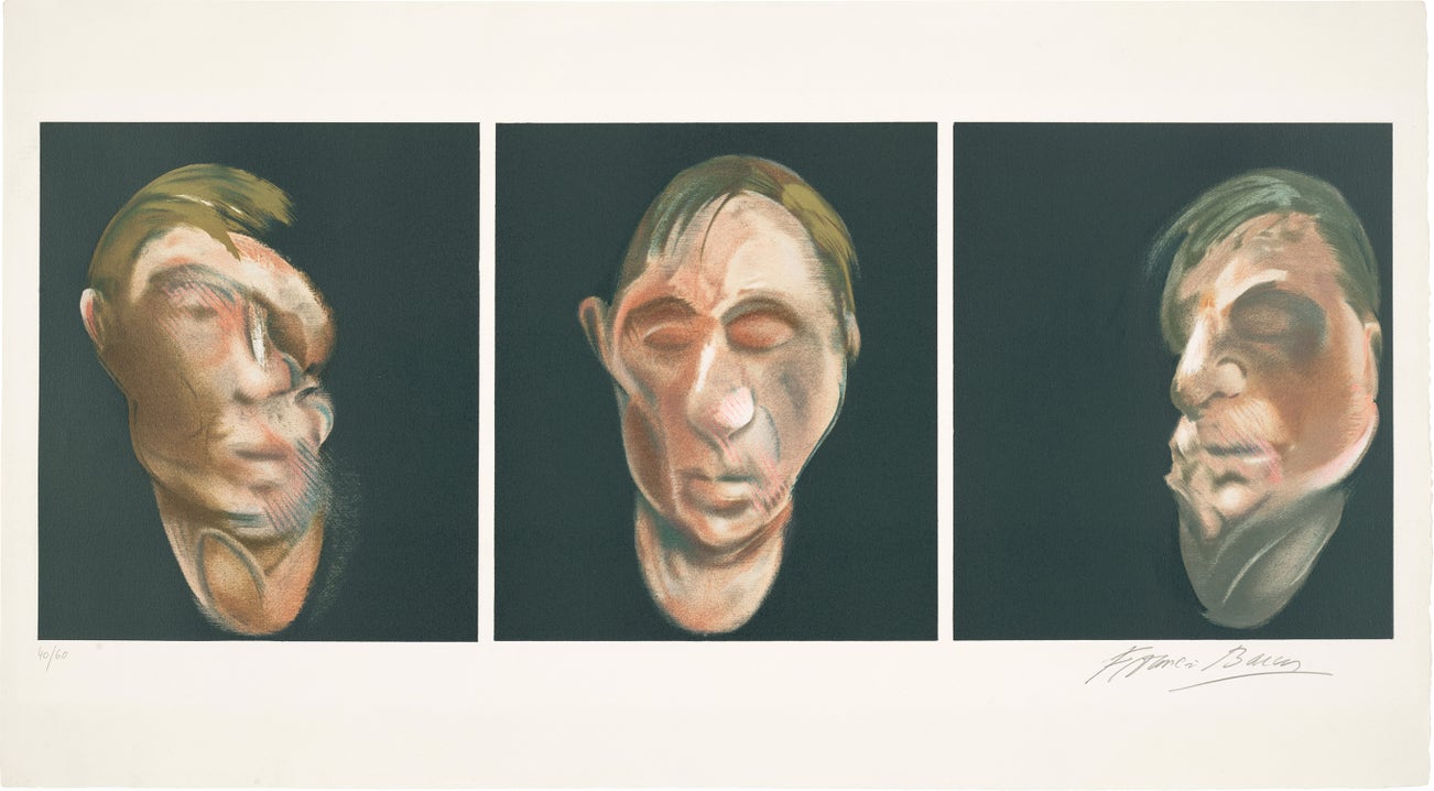 In conversation with yet challenging the conventions of Modern art, Bacon was known for his triptychs brutalizing formalist truths, particularly Three Studies for Figures at the Base of a Crucifixion, which Bacon debuted in London in 1944, and Three Studies of Lucian Freud, which became famous when it set the record for most expensive work of art at auction at the time it sold in 2013.