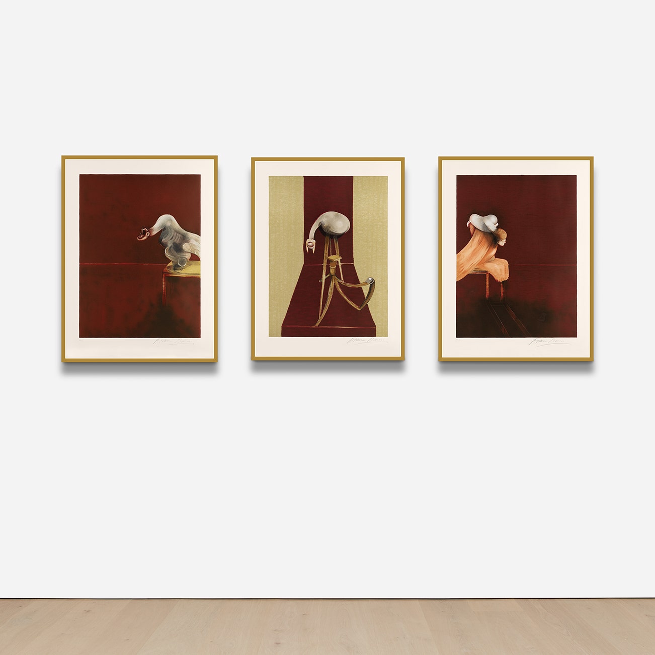 In conversation with yet challenging the conventions of Modern art, Bacon was known for his triptychs brutalizing formalist truths, particularly Three Studies for Figures at the Base of a Crucifixion, which Bacon debuted in London in 1944, and Three Studies of Lucian Freud, which became famous when it set the record for most expensive work of art at auction at the time it sold in 2013.