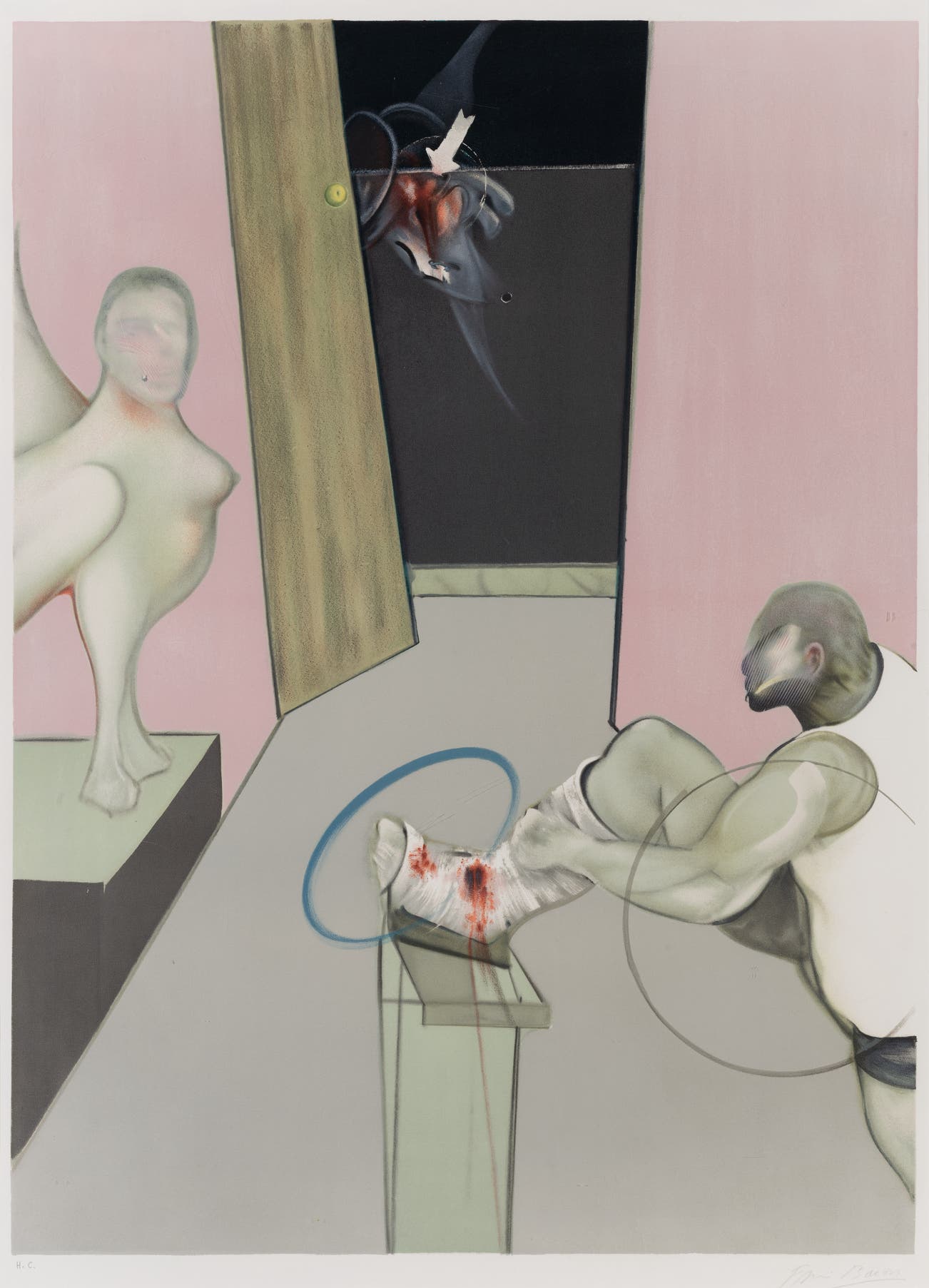 In conversation with yet challenging the conventions of Modern art, Bacon was known for his triptychs brutalizing formalist truths, particularly Three Studies for Figures at the Base of a Crucifixion, which Bacon debuted in London in 1944, and Three Studies of Lucian Freud, which became famous when it set the record for most expensive work of art at auction at the time it sold in 2013.