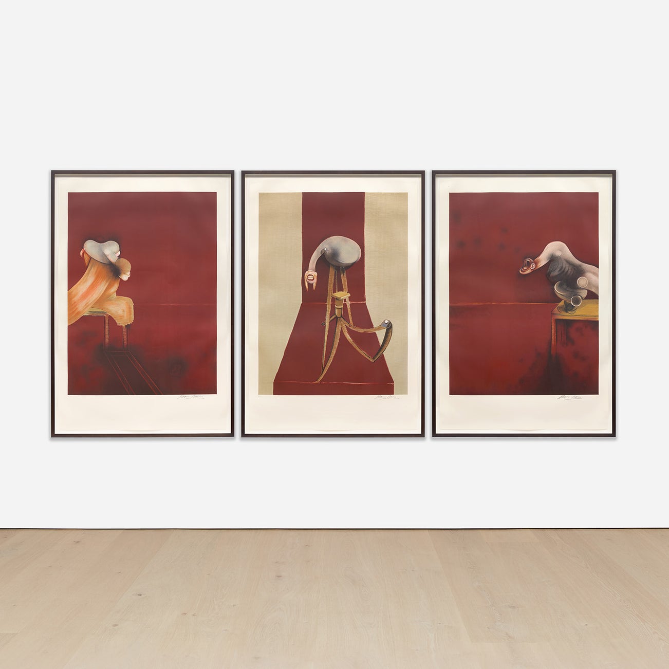In conversation with yet challenging the conventions of Modern art, Bacon was known for his triptychs brutalizing formalist truths, particularly Three Studies for Figures at the Base of a Crucifixion, which Bacon debuted in London in 1944, and Three Studies of Lucian Freud, which became famous when it set the record for most expensive work of art at auction at the time it sold in 2013.