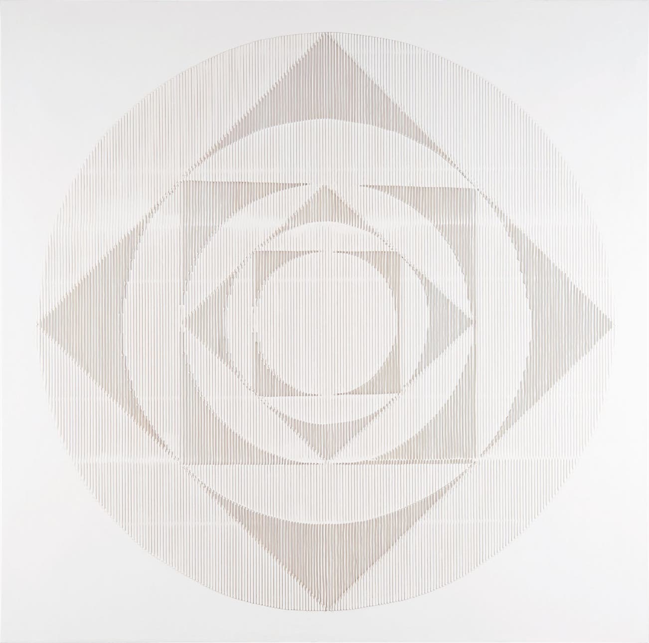 The optical phenomenon proposed by Salazar is based on the play of light – positive and negative – produced by the meticulous treatment of corrugated cardboard. Triggered by light, the delicate nuances on Salazar’s white monochromes overlap in the viewer’s eyes, activating a subtle retinal vibration that can only be described as kinetic poetry. This exquisite piece is truly unique due to the uncommon circular shapes, rather than the artist’s typically linear compositions.