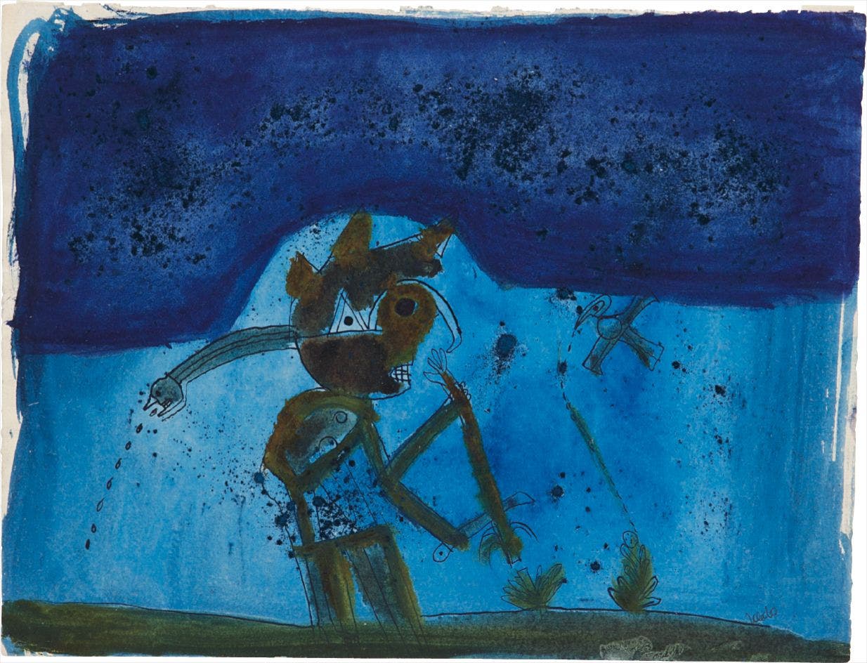 He has produced an incredibly prolific body of work that includes lithographs, engravings, watercolors, sculpture, ceramics and tapestries. He renders these fantastical creatures and forms with bold painterly brushstrokes and manipulates the texture by employing gold leaf and sand in certain areas. His works continually deal with the physical exploration of material, providing the viewer with insights into his process and imagination.