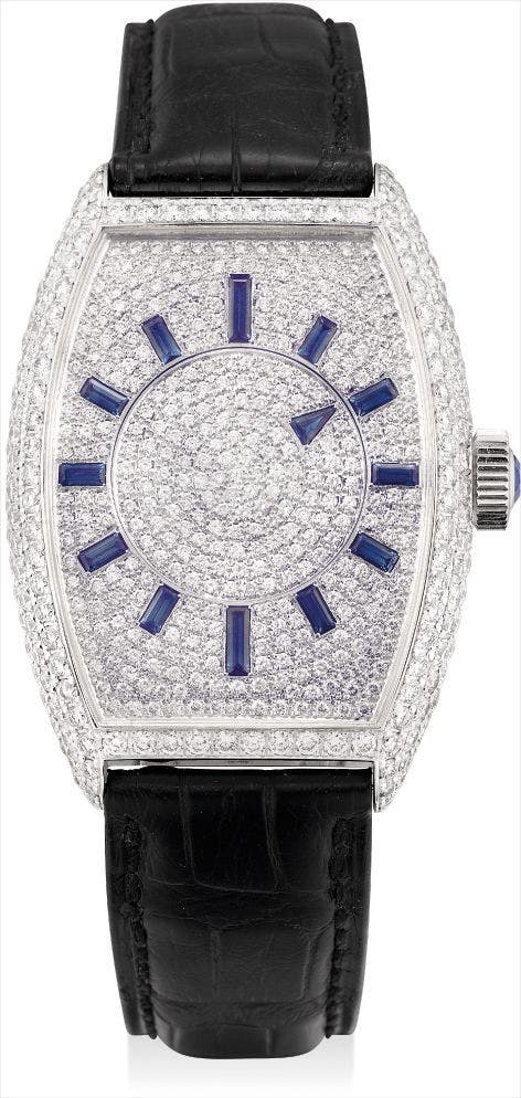 A fine white gold, diamond and sapphire-set tonneau-shaped wristwatch