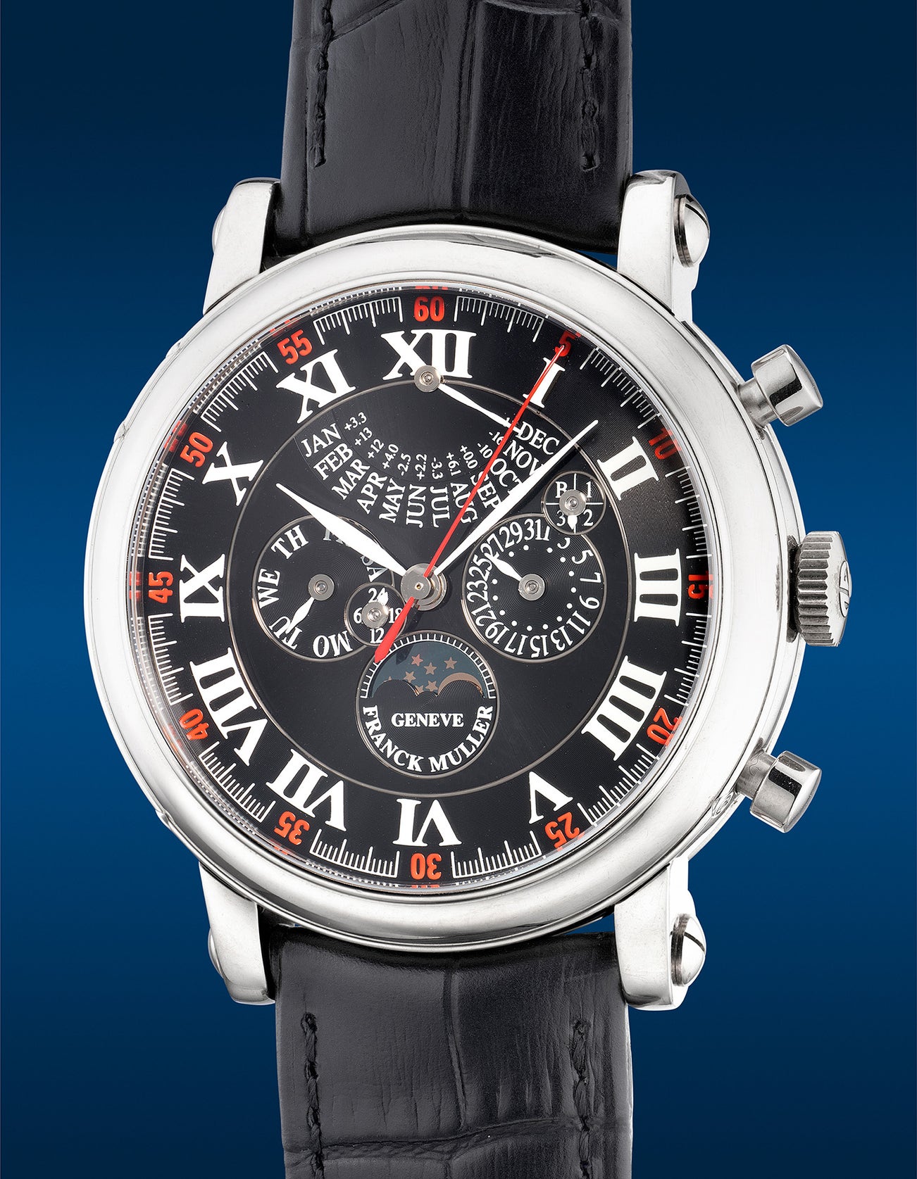 The present Franck Muller ref. 7008 CC QP E I in white gold belongs to a limited edition of 50 pieces featuring a handsome black dial with red and white accents. Equipped with a perpetual calendar chronograph function, it indicates month via retrograde style.