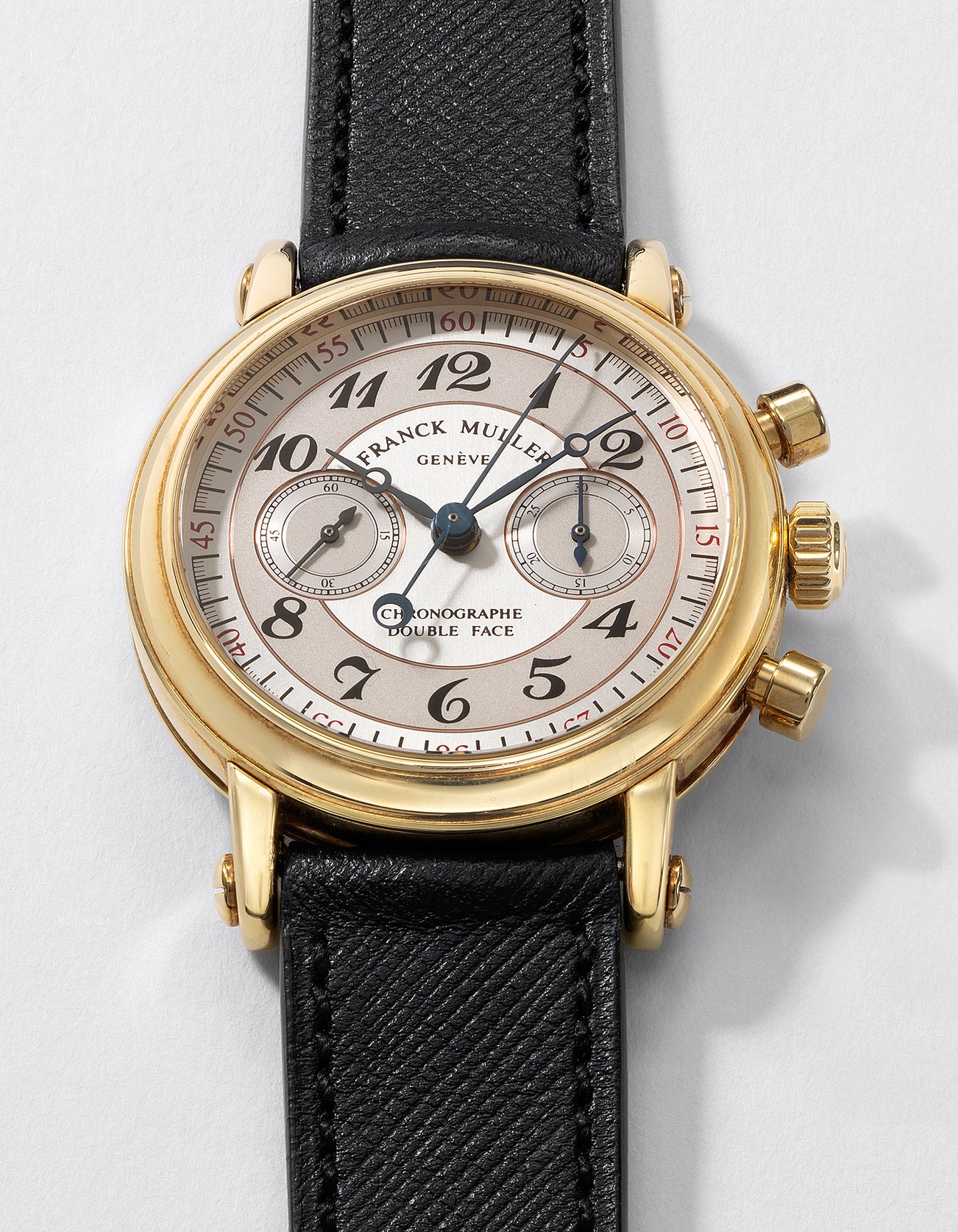 Offered in excellent overall condition, the present Franck Muller Double Face Chronograph ref. 2870 NADF in 18K yellow gold from circa 2004 is a rare bird that has recently gained a following due to the rising trend of early Franck Muller chronographs.