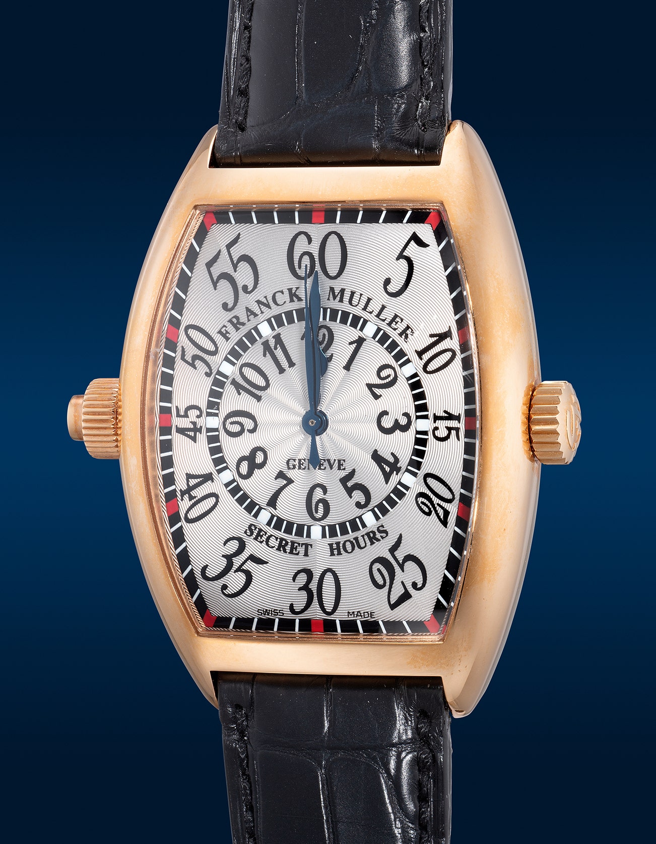 - The Secret Hours also embodies the essence of the classic Franck Muller with beautiful craftsmanship and finishing on the case and dial. The pink gold Cintrée Curvex case for the present watch is enhanced with a layer of patina, matching the black and red minutes and seconds outer ring. The dial is embellished by exquisite flinqué guilloche, and blued pear and double-feuille hands, emanating supreme elegance.