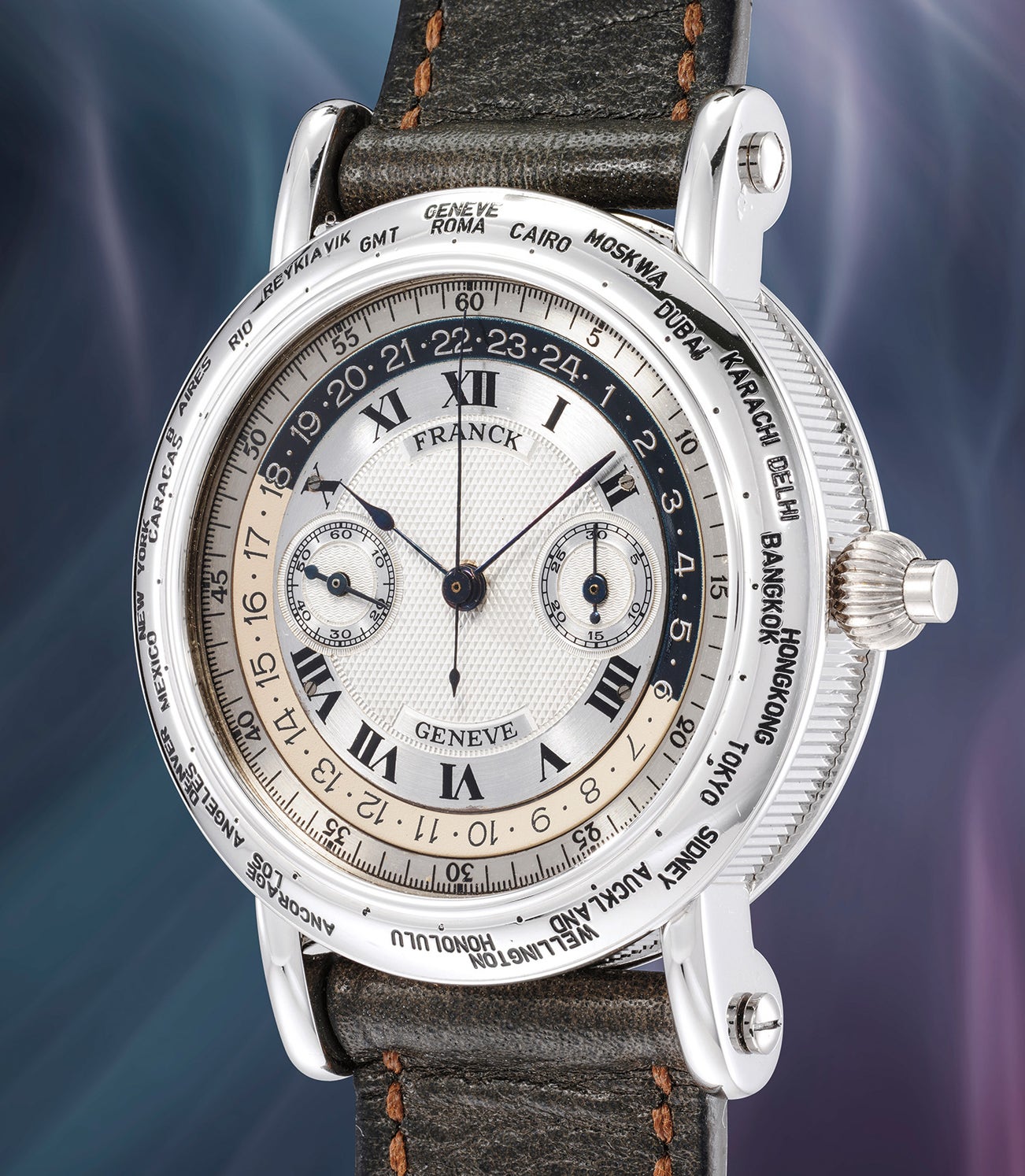 1991: double faced worldtime with single button chronograph (the present watch and the last piece he made before using Franck Muller)
