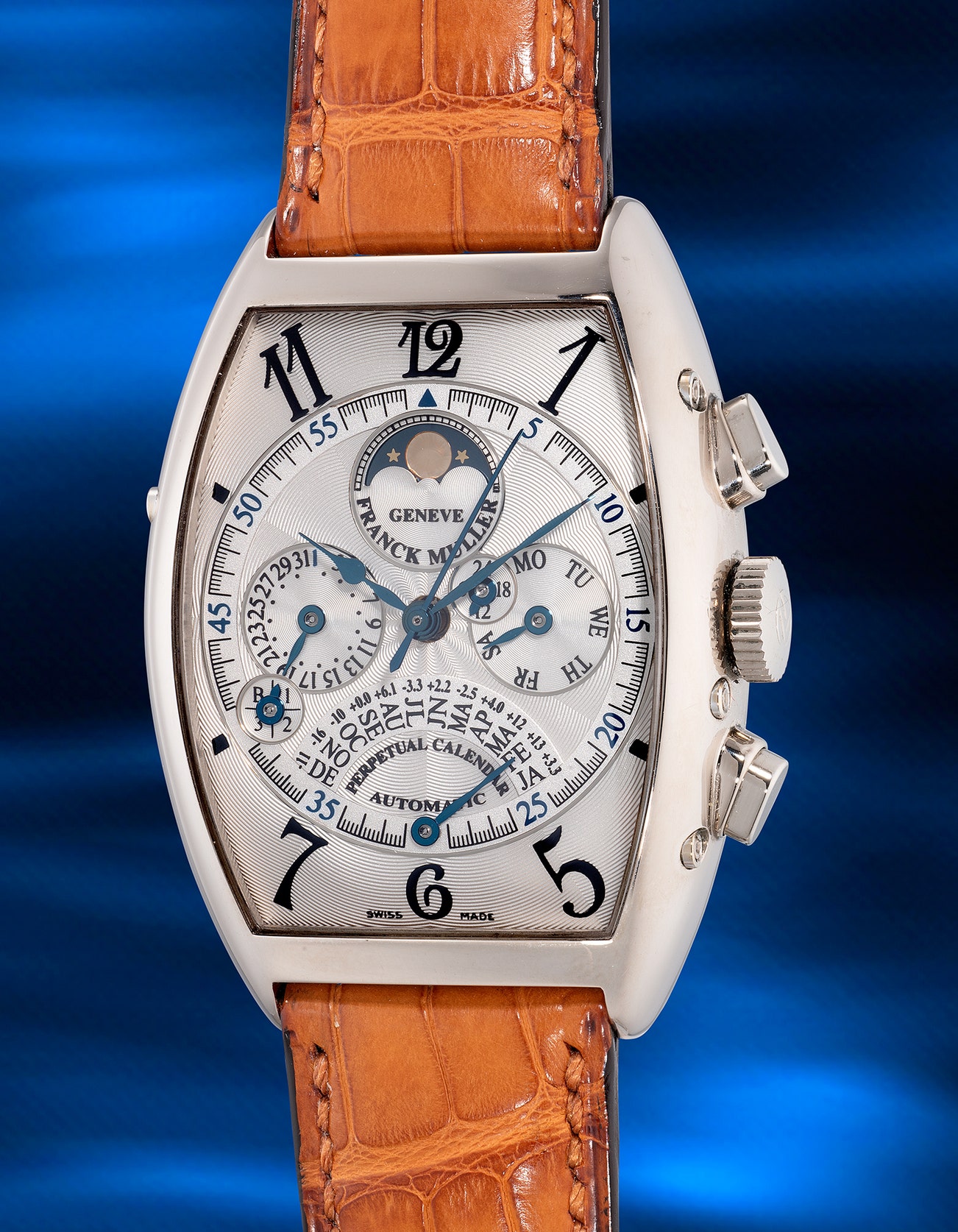- The current offering is no exception, as it features an extraordinary movement housed in Franck Muller's iconic tonneau-shaped case. The use of white gold provides the necessary heft for this mechanical masterpiece. In addition to being a chronograph and perpetual calendar, the watch also includes a retrograde hand to indicate the month as well as the equation of time. The movement, wounded by a platinum rotor, is a work of art in itself and deserves its praise.