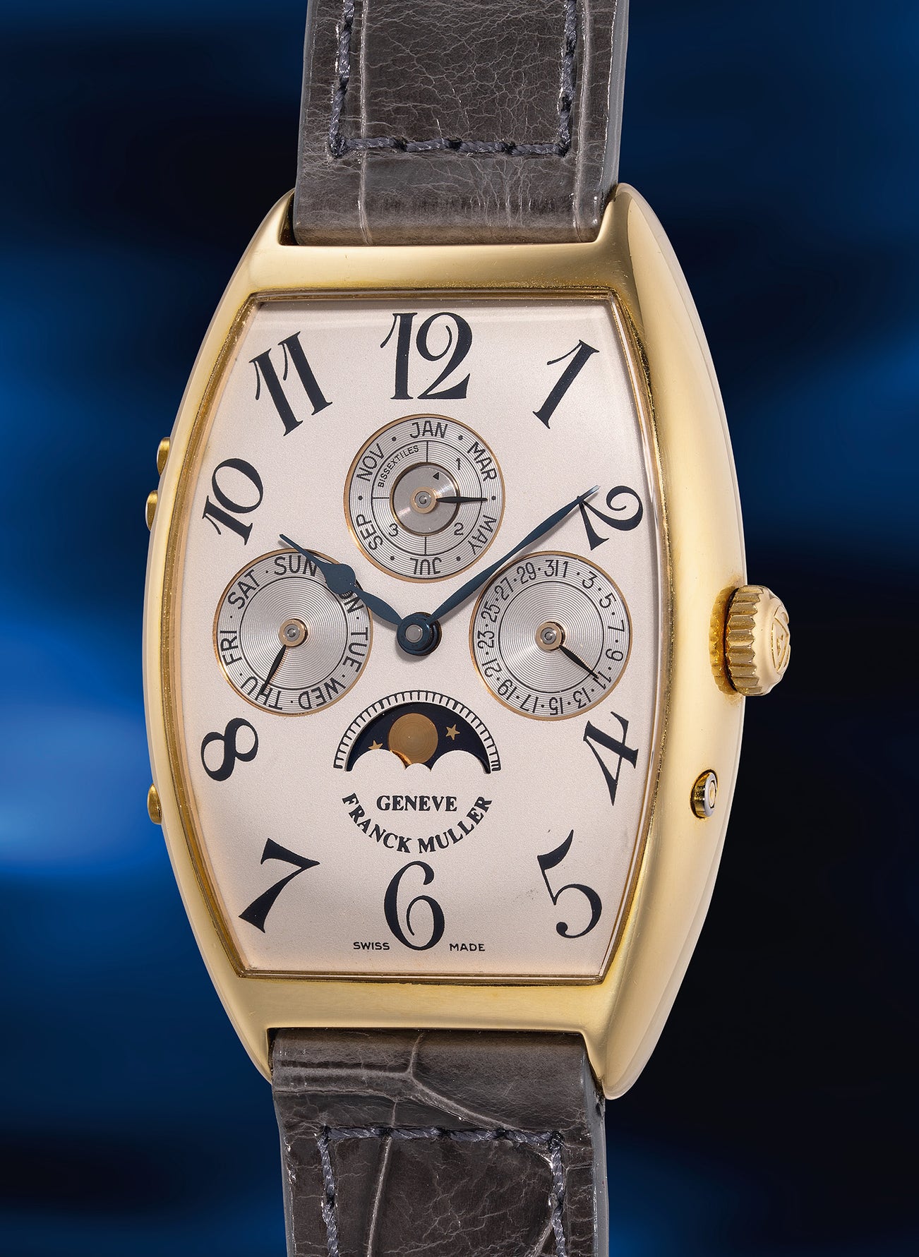 A well-preserved, early and rare yellow gold tonneau-shaped perpetual calendar wristwatch with moon phases and leap year indication