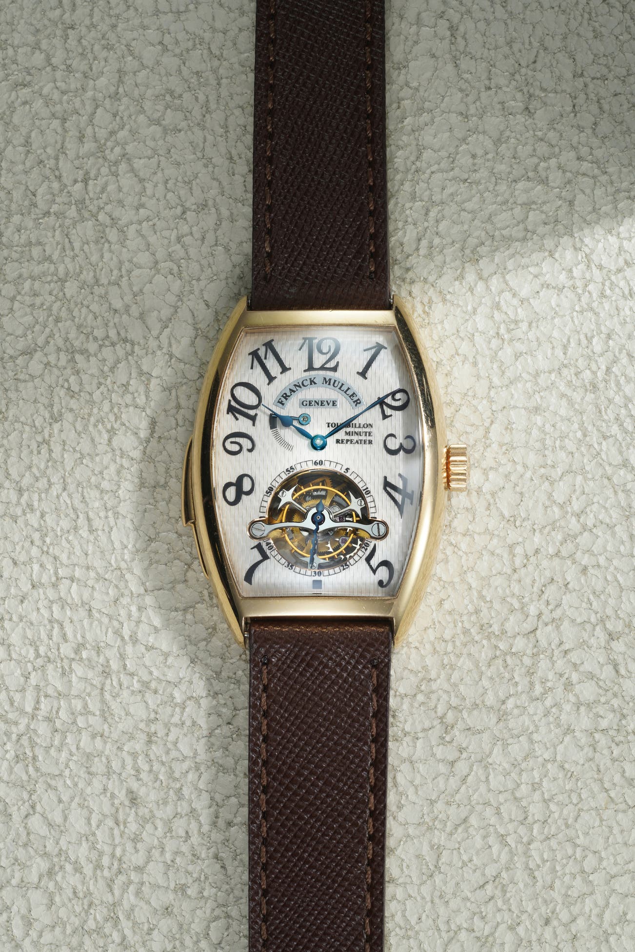 A superb and highly distinguished yellow gold minute repeating wristwatch with tourbillon, minute repeater status indication and Certificate