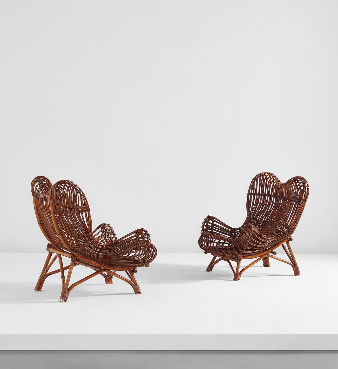 The Gala armchair was designed in 1951 by Franco Albini and Ezio Sgrelli for the crafts and small industries organization's section at the IX Milan Triennale. The presentation was a collection of furniture for the department store La Rinascente. The two designers worked with Vittorio Bonacina & C., a company founded in the nineteenth century specializing in rattan furniture, to create a distinctive design that combined readily available raw materials with traditional craftsmanship. Inspired by the basket-making techniques of southern Italy, Albini and Sgrelli exploited the elasticity of the rattan and cane to shape the elegant curves of the chair. Designed between 1951 and 1952, the present armchair is a second variation of the Gala model featuring an adjustable seat which enables the chair to adjust to a reclined position.