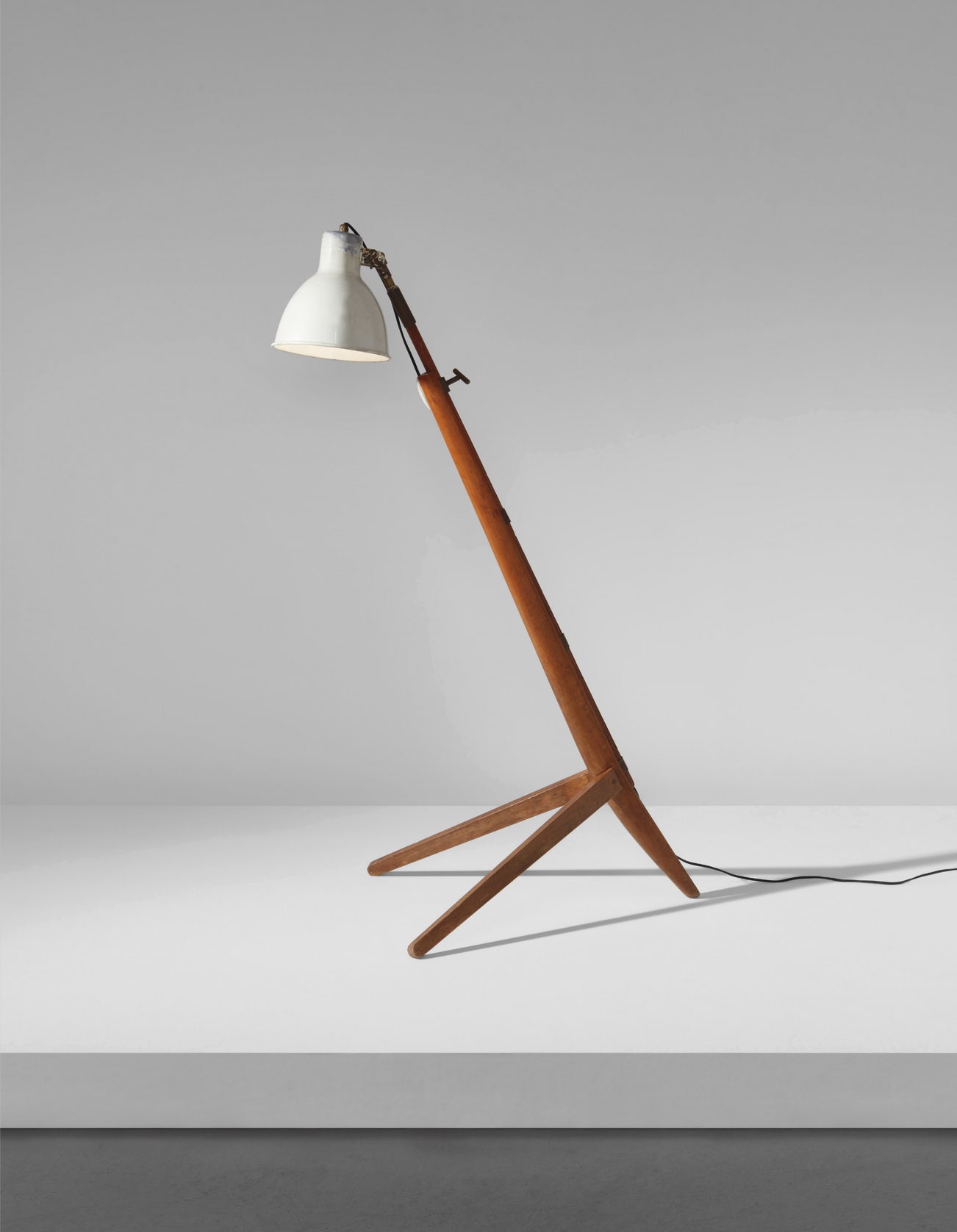 In the late 1930s, Franco Albini began to consider the notion of variation in his designs of "Mitragliera" floor lamps. In the genesis and evolution of the design, Albini conceived models with a variety of materials and constructive details in a persistent search for new artistic realizations. The configuration of the lamp recalls the form of a classic tripod machine gun: the legs angled out, taking aim with the lampshade located at the end of the barrel. In the process, Albini aspired for his designs to fit seamlessly into the rise of a culture based on mass production.