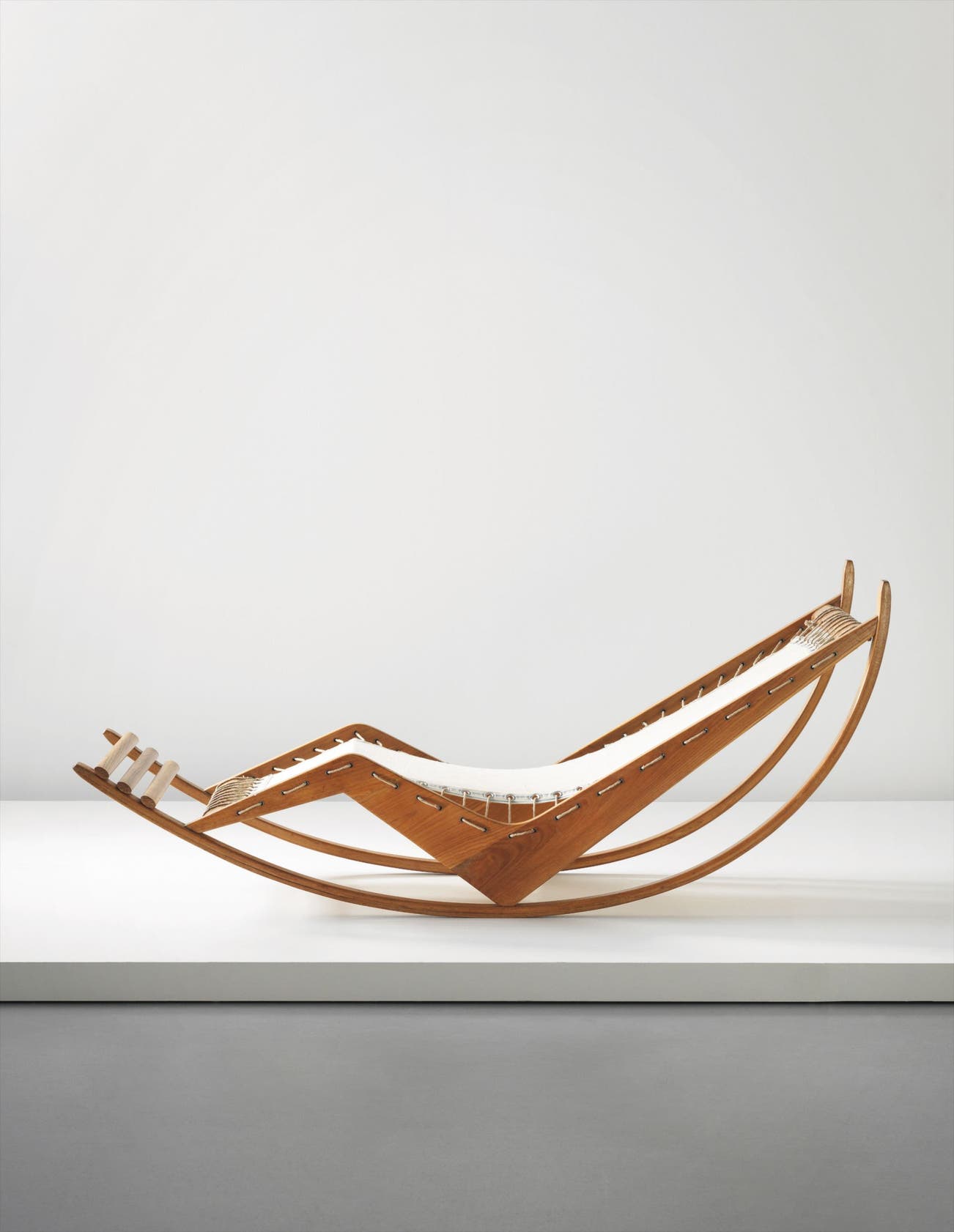 The present model is an early design of the rocking chaise longue, which was included in the exhibition ‘Mostra dei criteri della casa oggi’ at the VII Triennale di Milano, in 1940.