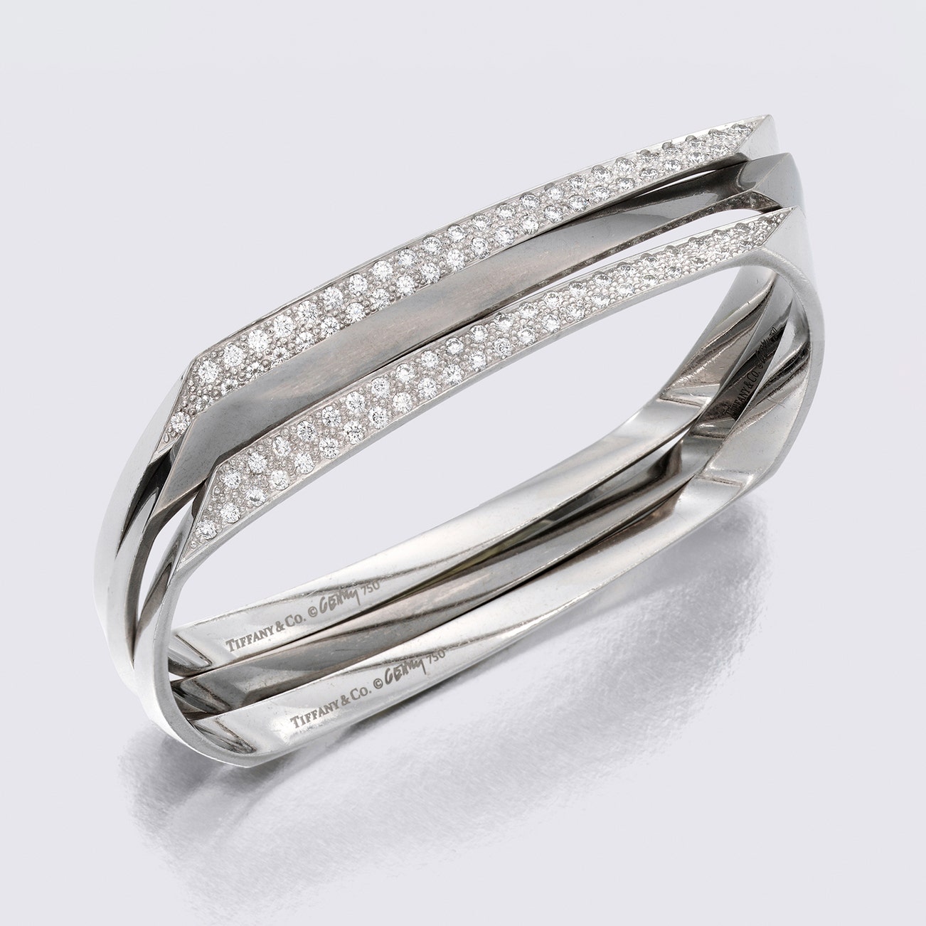 Comprising three bangle bracelets, one set with blackened gold; two decorated with brilliant-cut diamonds, mounted in 18K white gold and blackened gold, inner circumference 7 1/2 inches, signed Tiffany & Co. Gehry.