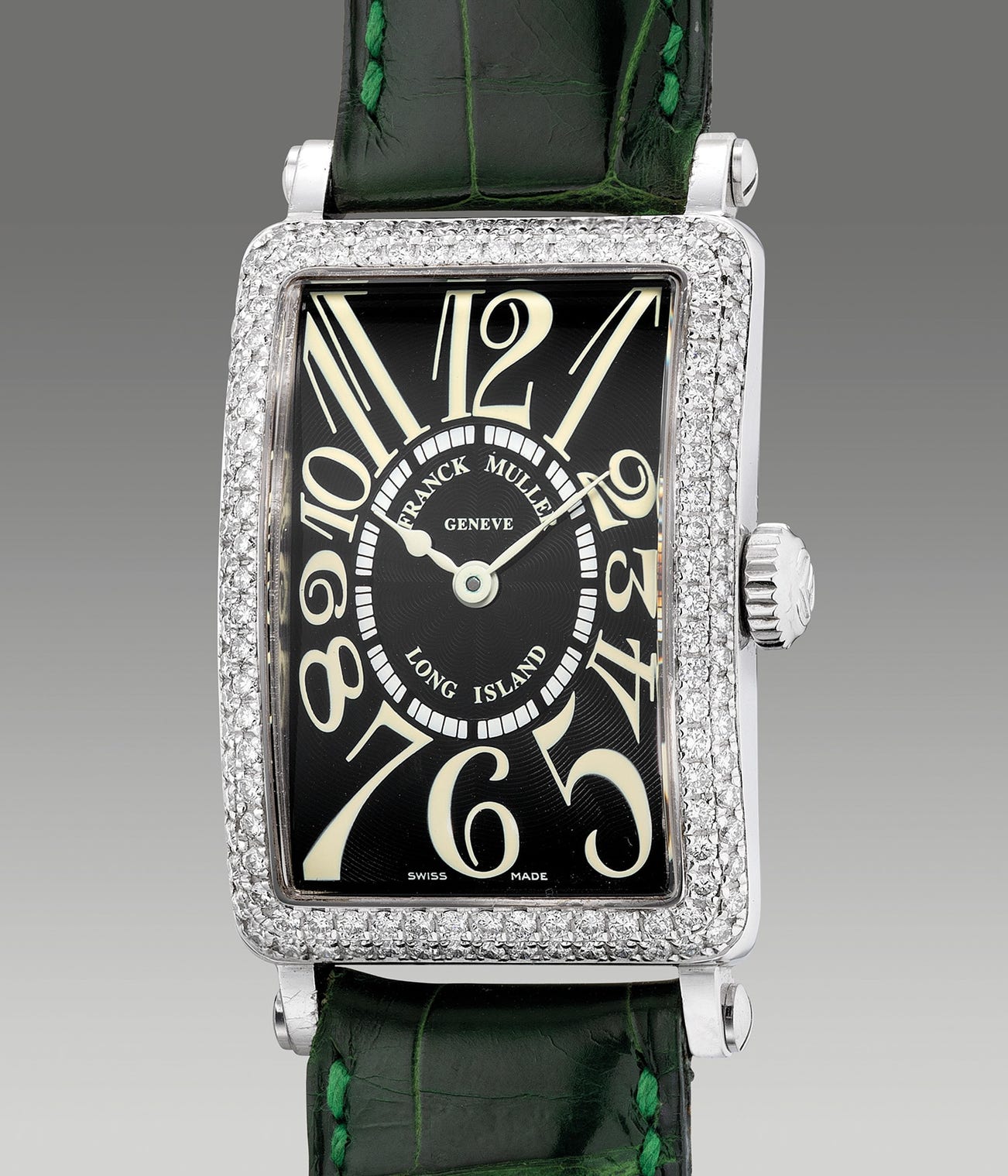 The present Frank Muller Long Island ref. 900 QZ D in 18K white gold and diamond-set case powered by a quartz movement features a black dial with cream numerals in its signature font. It is also complete with its original certificate and presentation box.