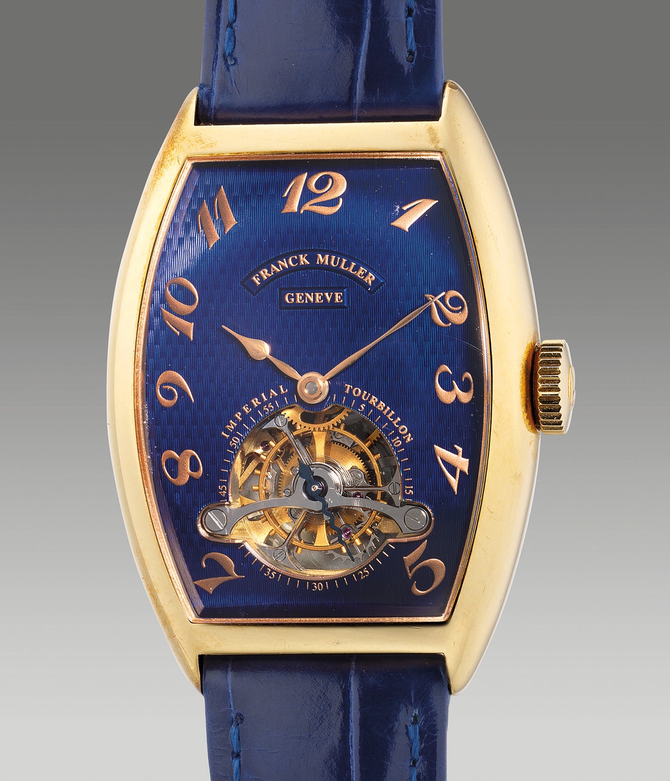 A fine and impressive yellow gold tonneau-shaped tourbillon wristwatch with small seconds, guilloché enamel dial and Breguet numerals