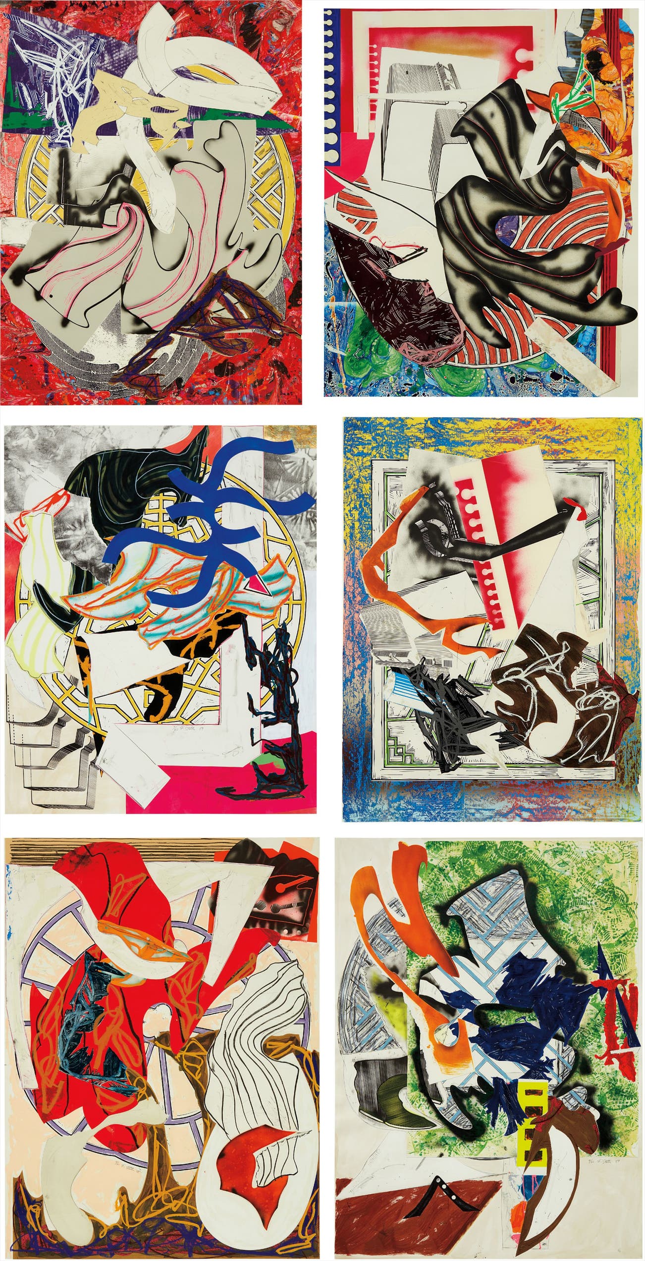 Six screenprints with lithograph and linocut in colors with hand-coloring, marbling and collage, on T.H. Saunders paper, the full sheets.