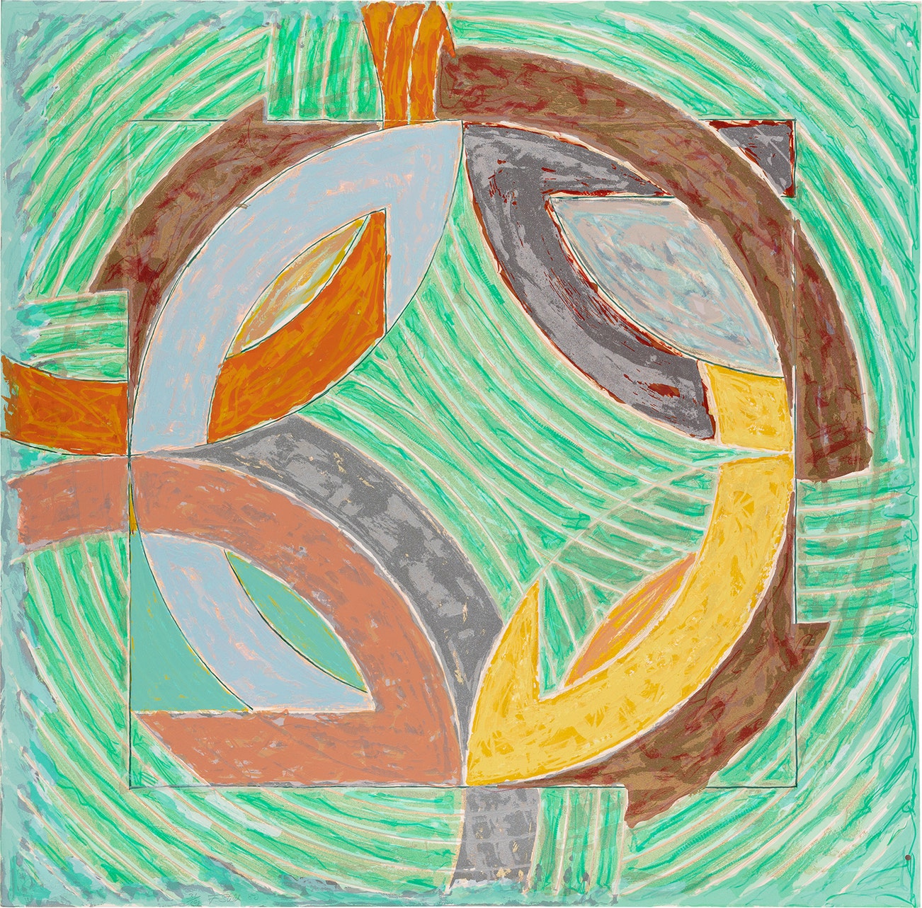 'The title Polar Co-ordinates for Ronnie Peterson was derived from the grid component and the name of Swedish auto racer and friend of Stella's who died in the Grand Prix at Monza in September 1978. The spinning energy of forms in the prints evokes the great speed of Formula 1 racing.' - Richard Axsom, Frank Stella Prints, p. 206