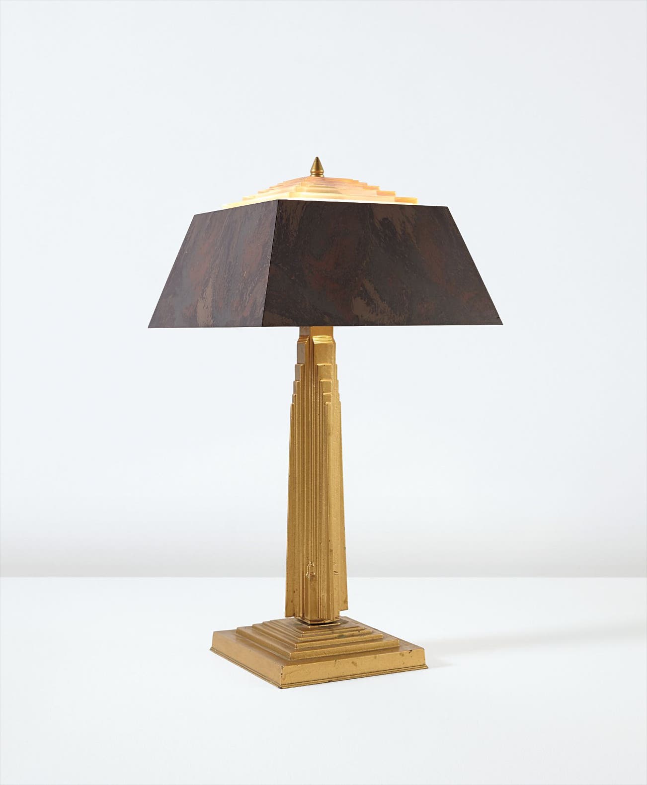 Franklin Booth is best known for his illustrations, which appeared in major American publications of the period. His characteristic style of drawing that emulated the fine lines of a wood cut print is evident in the delineated profile of the present design. Booth's one other foray into lighting design was a 1920 patent for a lampshade design commemorating World War I, and to be used on the "Victory" lamps produced by Snead and Company of Morgan, New Jersey. That shade cleverly presented two scenes: when unlit a war scene illustration was visible on the exterior, when illuminated a peacetime scene would shine through from the interior. Less than a decade later, Booth's second lamp design (presented here) once again reflected contemporary American preoccupations in its adoption of a skyscraper form. This design is recorded under the United States patent number D78189 S, published April 9, 1929.