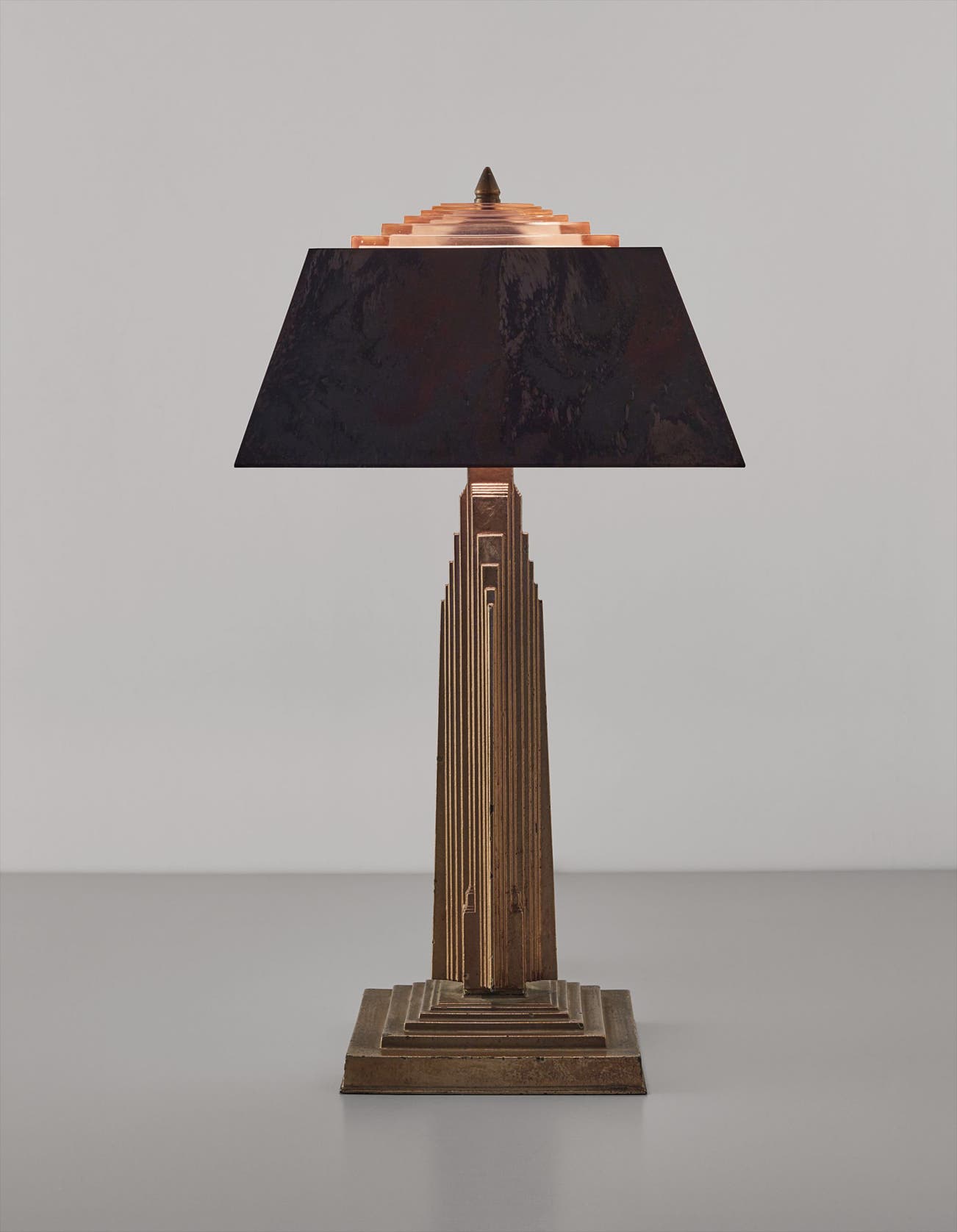 Franklin Booth is best known for his illustrations, which appeared in major American publications of the period. His characteristic style of drawing that emulated the fine lines of a wood cut print is evident in the delineated profile of the present design. Booth's one other foray into lighting design was a 1920 patent for a lampshade design commemorating World War I, and to be used on the "Victory" lamps produced by Snead and Company of Morgan, New Jersey. That shade cleverly presented two scenes: when unlit a war scene illustration was visible on the exterior, when illuminated a peacetime scene would shine through from the interior. Less than a decade later, Booth's second lamp design (presented here) once again reflected contemporary American preoccupations in its adoption of a skyscraper form. This design is recorded under the United States patent number D78189 S, published April 9, 1929.