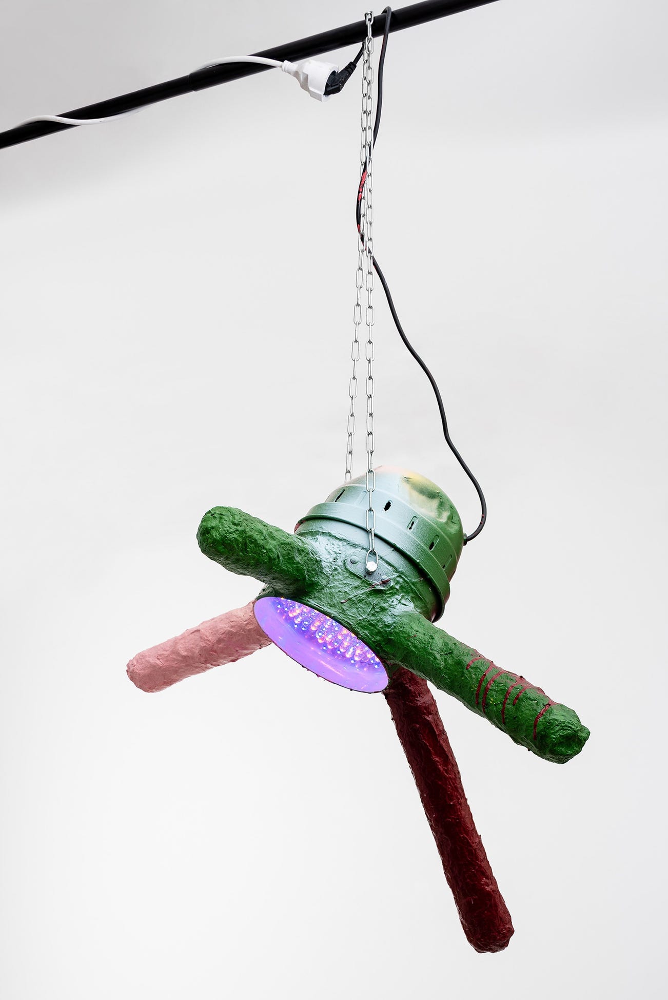LED lamps, papier mâché, cardboard tubes and metal chain