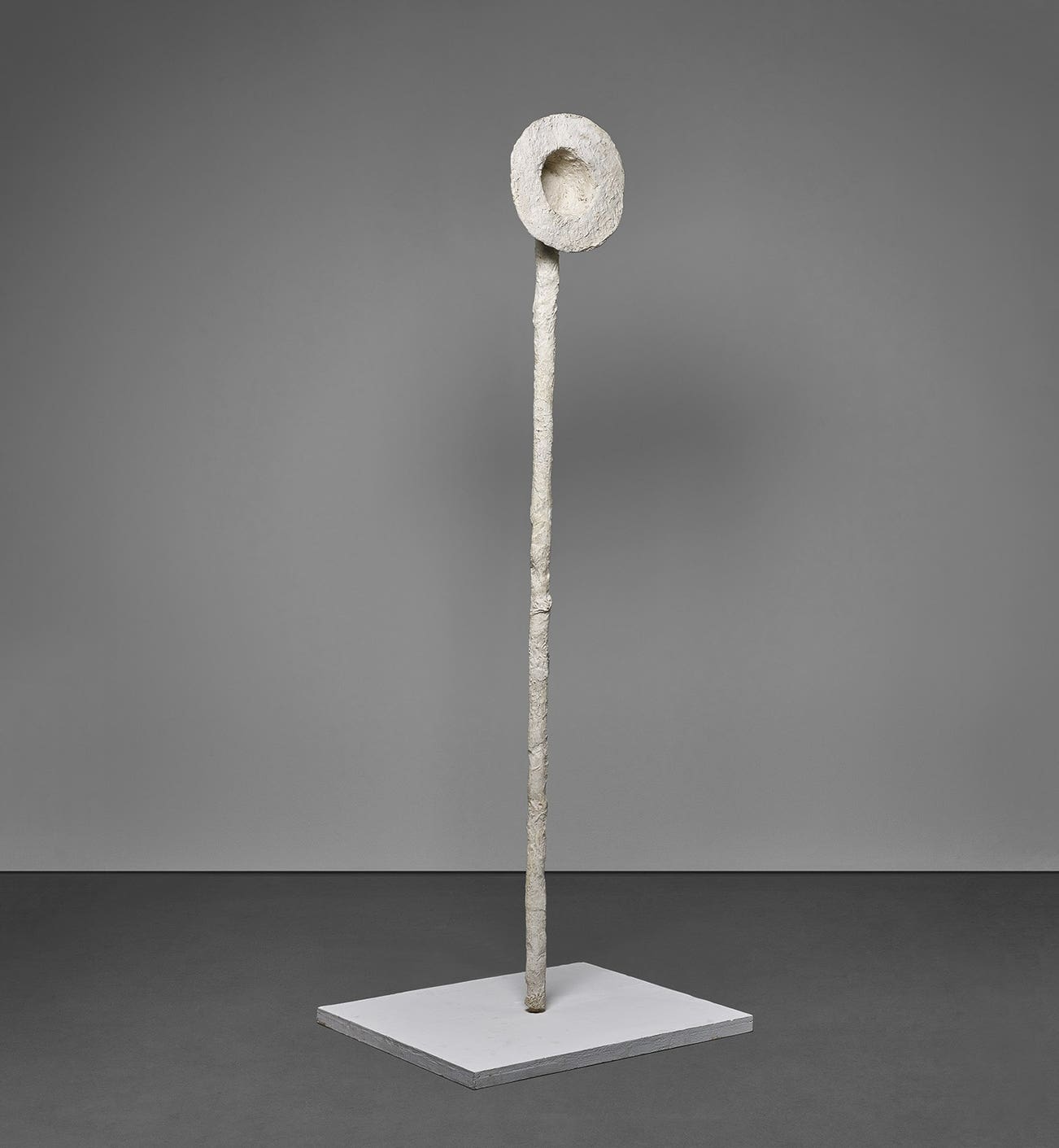 Central to West’s practice are the artist’s titles and descriptions, perplexingly assigned in various languages – German, English and French among others. Herein, the title Schnorre identifies the object as a scrounger or beggar in German; a linguistic designation only to be reified by Schnorre’s appearance, which visually dissects the familiar form of a headpiece atop its constitutive metal pole, thus playing on the action of begging and collecting change in a hat. Drawing closely on Ludwig Wittgenstein’s ‘Philosophical Investigations’, 1953, West further conveys the importance of naming a work by noting that ‘[Wittgenstein] compared the use of language to the use of tools such as hammers and nails. He maintained that the meaning of a word is its use and advanced the idea of language games. If these tools were abstract, then they were understood as art’ (Franz West, in conversation with Roxana Marcoci, ‘Franz West’, MoMA, online).