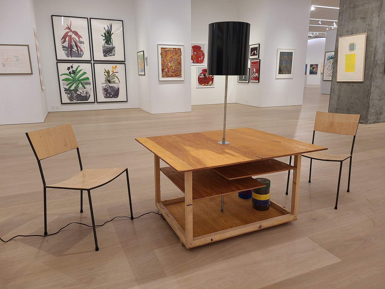 Please note this example is in its un-adorned state and has not been completed by adding the multi-color duct tapes to the table and chairs. The image of the work installed with the tape is only an example image. The work begins as a crate with the contents of the piece contained within. Once opened the sides of the crate become the table top and inner shelves. Once assembled it is decorated. The tape is removed when it is packed up again.