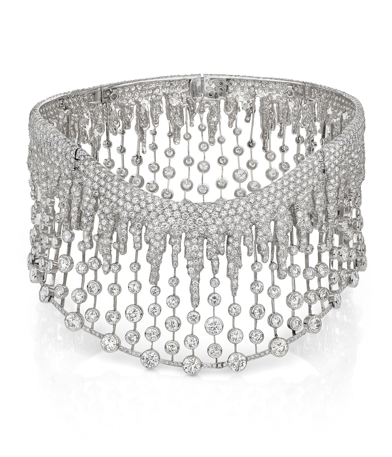 Designed as a cascade of brilliant-cut diamonds, suspending a series of collet-set brilliant-cut diamonds, inner circumference approximately 325mm, signed Fred Leighton, assay mark, fitted case stamped Fred Leighton, together with a tiara frame.