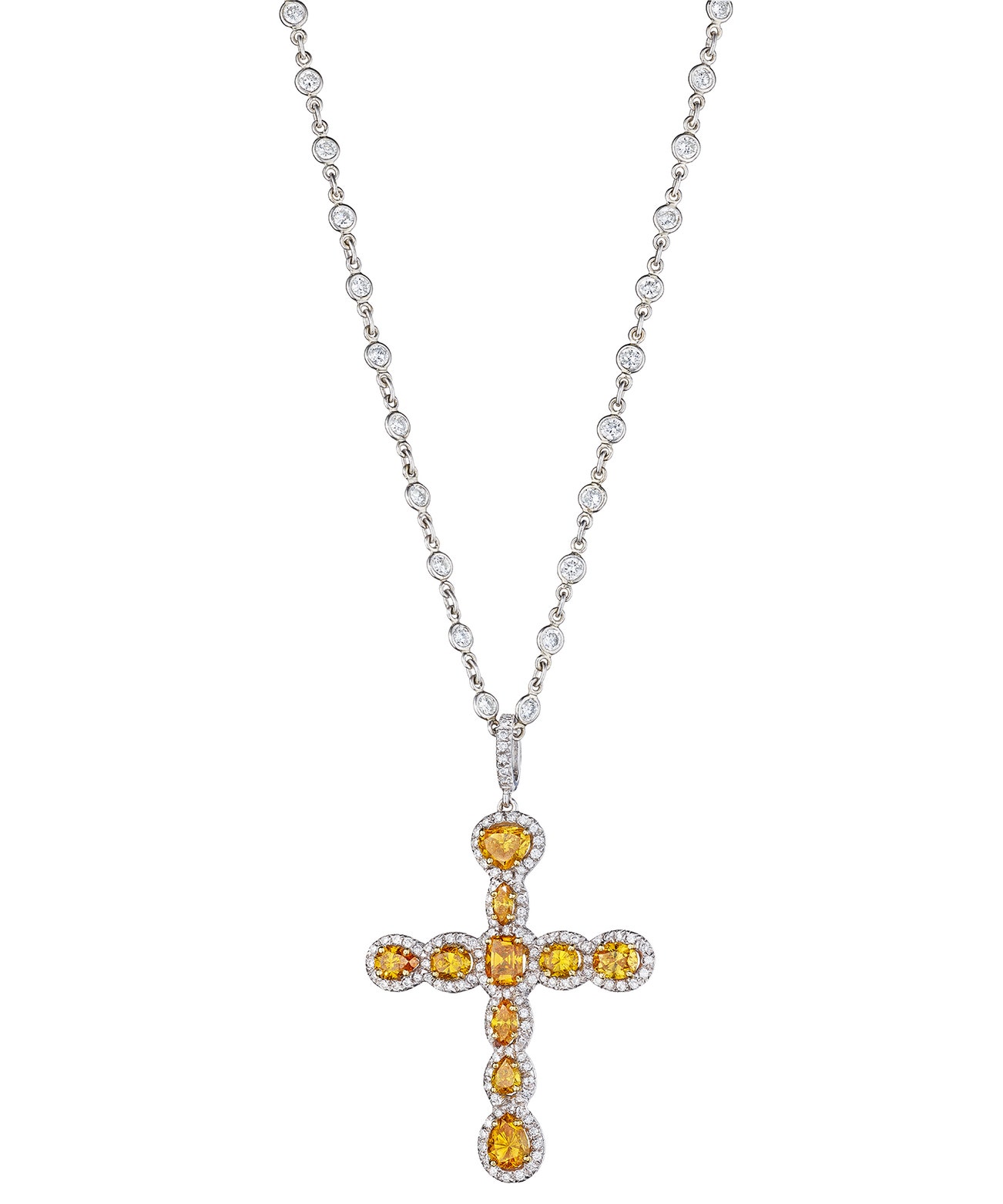 Orange Sapphire and Diamond Cross Pendant Necklace