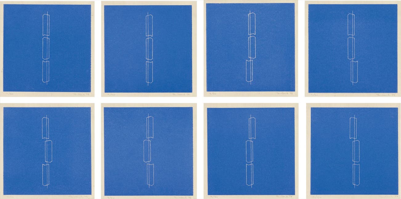 The complete set of eight linocuts in blue, on Japanese laid paper, with full margins,