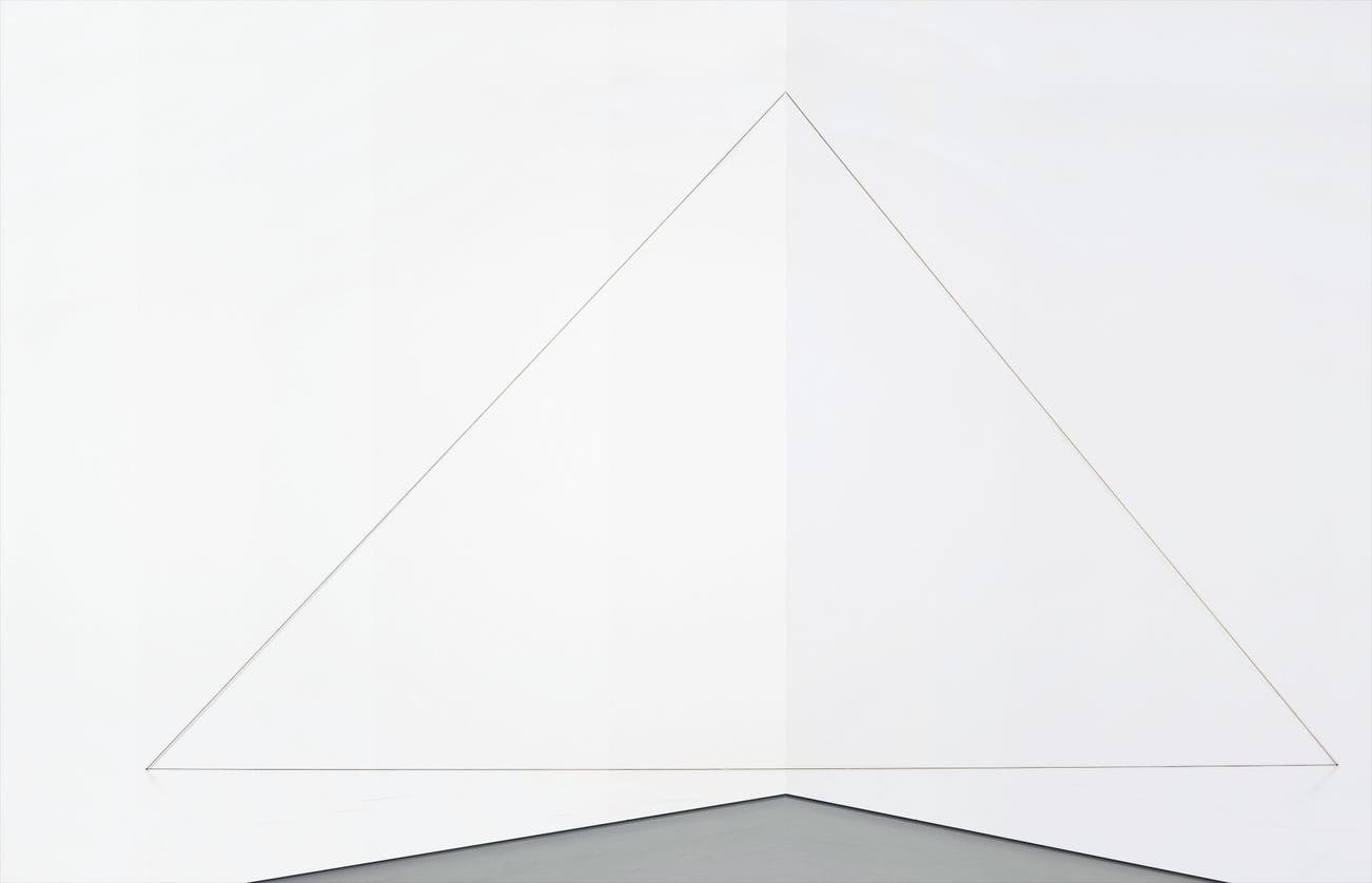 Through Untitled (Triangle) the artist is producing a space, rather than simply existing in what is already there. Three threads intersect to create a visual experience, confounding both one’s preconceptions of sculpture as a medium and one’s own perceptions of space. Mass and weight have been dispersed through the use of ultra-light-weight acrylic yarn pulled taut, reaching diagonally from wall-to-wall. Sandback preferred it over other similar materials, such as wire, because its softness defied a strict rigidity of shape, and its matte surface absorbed rather than reflected light. All that exists are these threads, dematerialised lines of colour, defining the perimeters of a new space. Sometimes, ephemeral shadows assist the work, either adding or further delineating the created space. Sandback highlighted the ambulatory experience of his work; namely, his desire for viewers to coexist within this newly created space – whether that be by walking around, beside or through it. To participate is to step into a new spatial plane and an illusion of another reality. This involvement within the work engenders something akin to a phenomenological experience, forcing the audience to question themselves on how they inhabit and define the space around them. Untitled (Triangle) exists between the borders of Minimal and Conceptual art. Its physical presence may not be monumental, but the constant interpretations of the work lend it an impressive largeness in life.