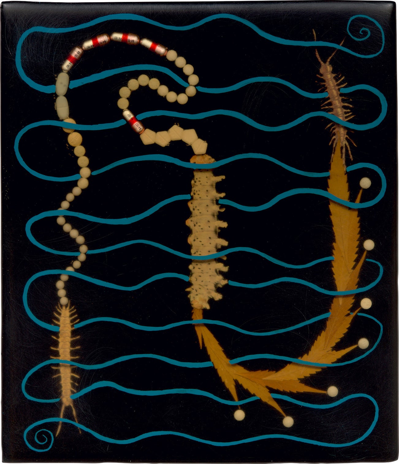 acrylic, pharmaceuticals, printed paper, beads and foliage in resin on panel