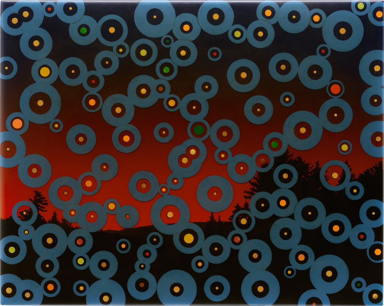 signed, titled and dated "Fred Tomaselli 1997 "Blue Circles before Blowdown"" on the reverse