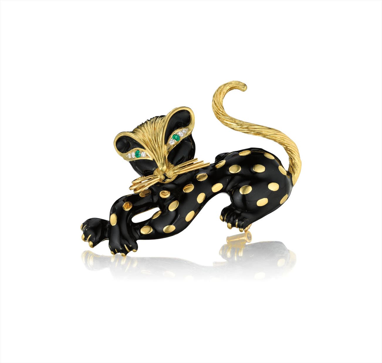 Designed as a spotted panther, the body enhanced by black enamel and polished gold spots, to the textured gold tail and pavé-set diamond and emerald eyes, mounted in 18K yellow gold, length 2 1/4 inches.