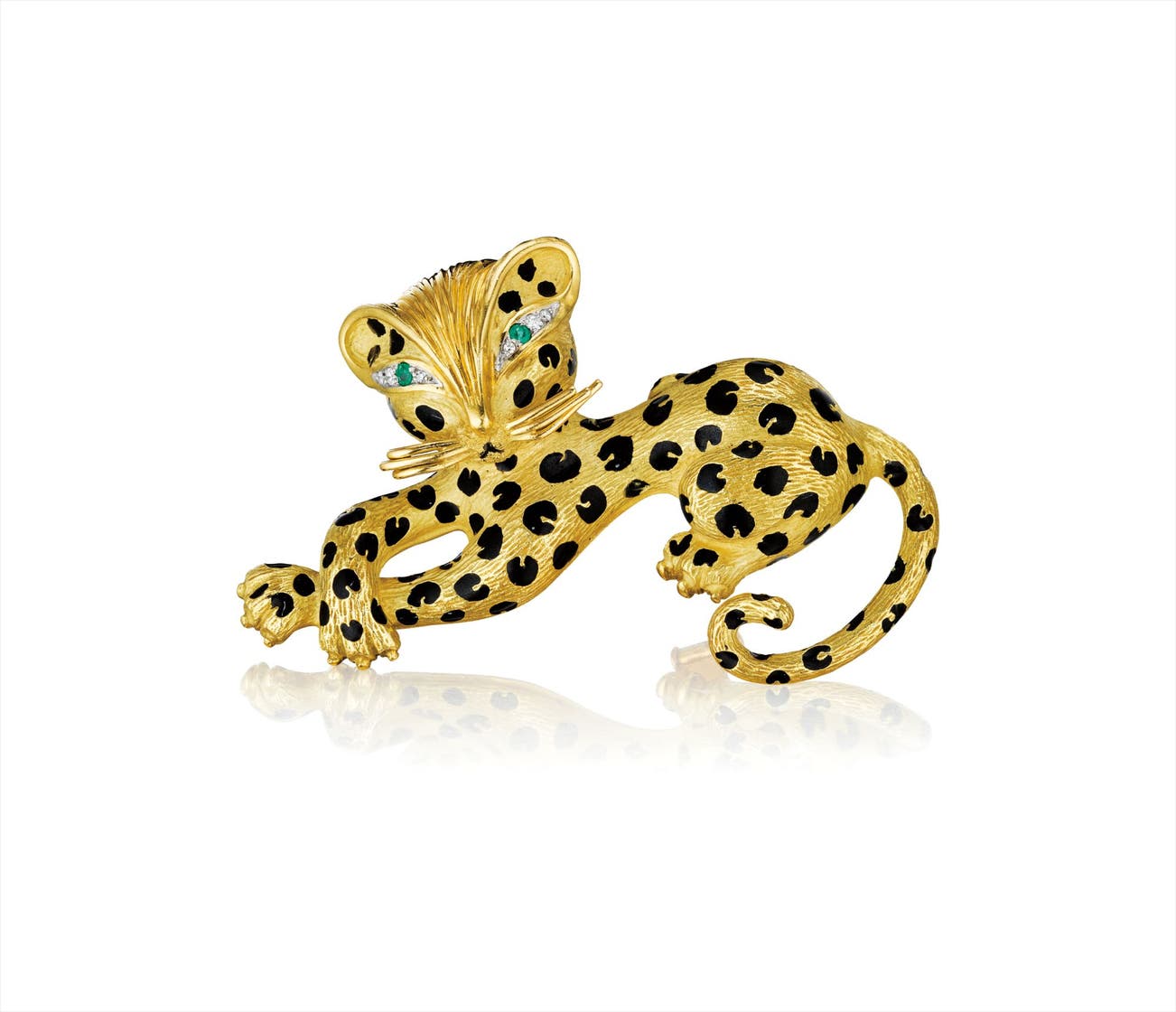 Designed as a leopard, the textured gold body enhanced by black enamel spots, to the pavé-set diamond and emerald eyes, mounted in 18K yellow gold, length 2 1/4 inches.