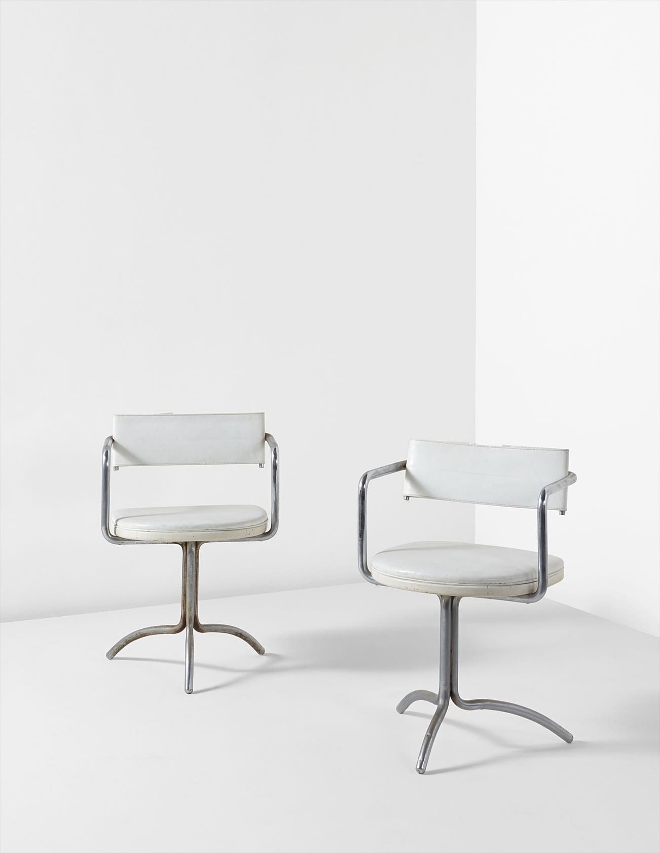 The present pair of armchairs are the only two existing examples from a set of six from the New York apartment of Charles and Marguerita Mergentime. One of the chairs from this set of six was included in the Frederick Kiesler exhibition at the Whitney Museum of American Art, New York, January 18-April 16, 1989. Kiesler's prolific designs for furniture and lighting are well-documented, though examples of realized models are rare.