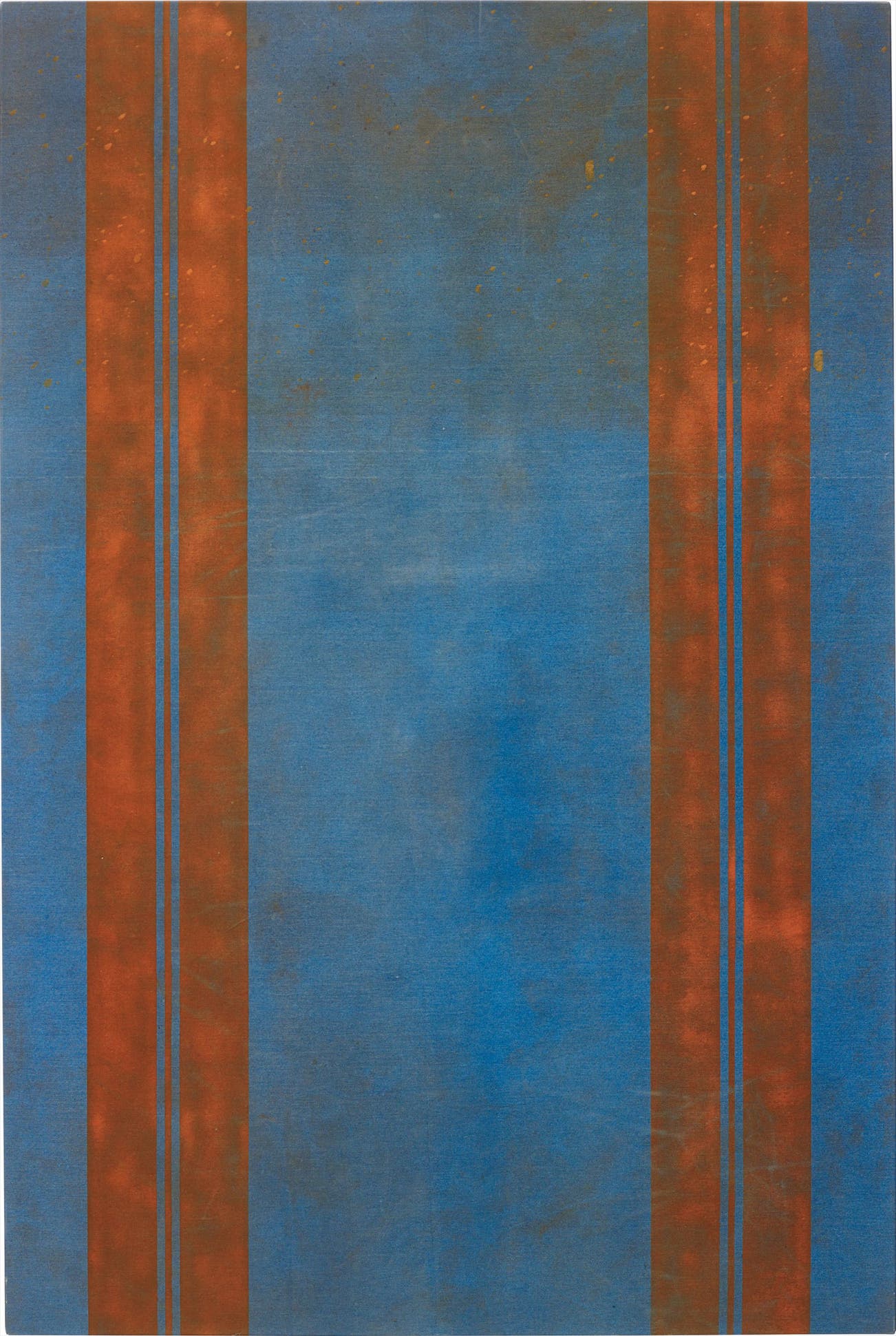 Part of the Canopy series, the present lot uses simple form to suggest a banal material most commonly associated with recreational vehicles and outdoor leisure, resulting in a collision of high and low culture on canvas. Værslev uses visual patterns of the everyday in conjunction with traditional processes to further drive these dichotomies. Stylistically evoking the zips of Barnett Newman, Untitled (Canopy Painting: Blue and Orange V) is a study of the way abstraction can fade in and out of figuration and vice versa: in his careful composition of line, colour and patina, Værslev renders representation of form to abstraction and decorative design to representation.
