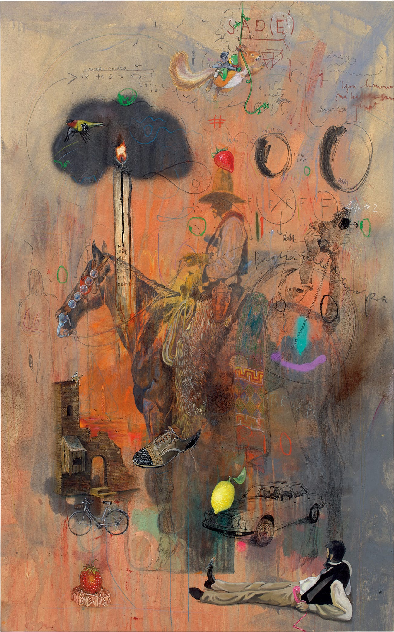 oil, acrylic, pastel, watercolor, colored pencil, charcoal, pencil and spray paint on canvas