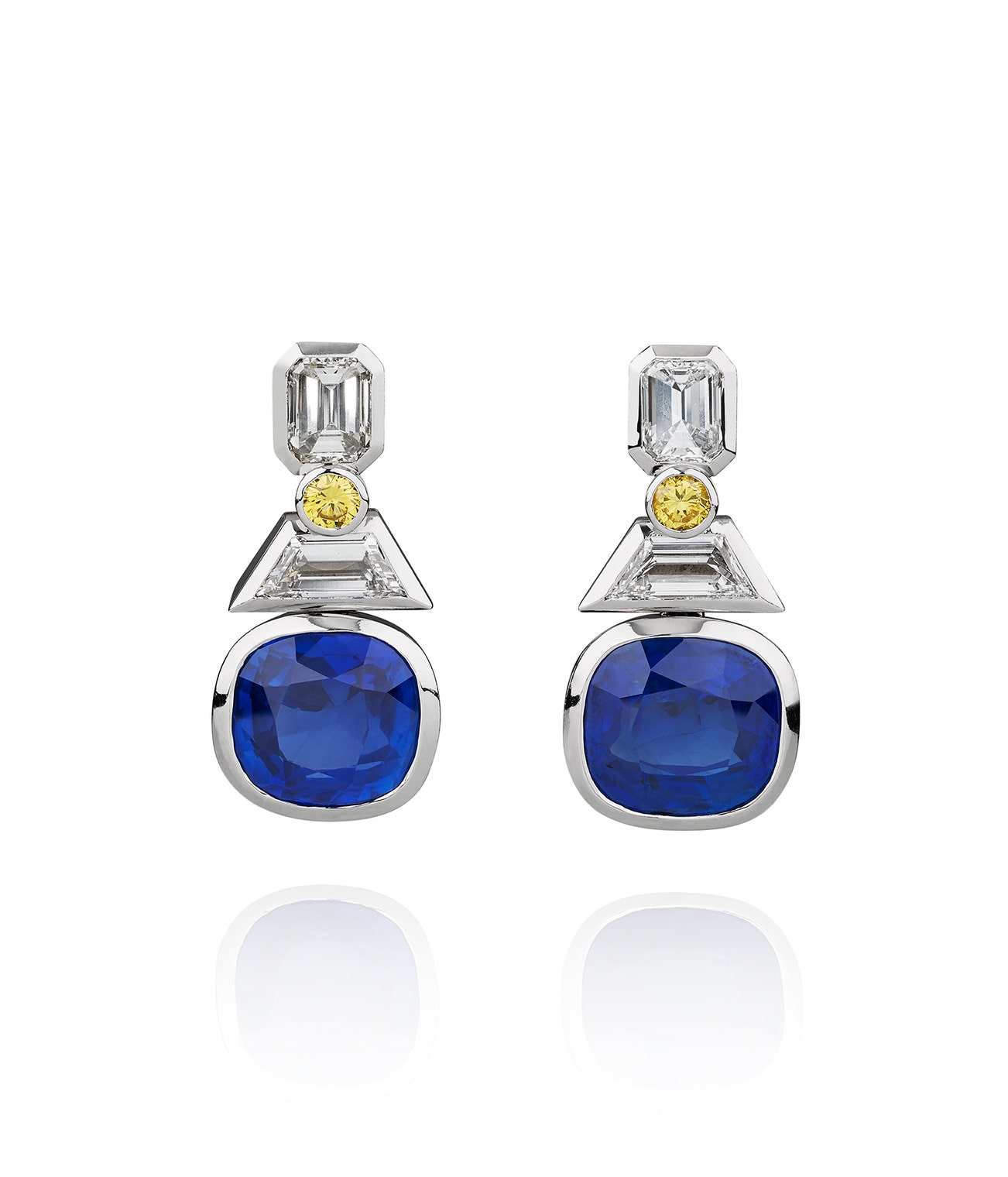 Each set with a cushion-shaped sapphire, highlighted with tapered baguette and step-cut diamonds, and brilliant-cut diamonds of yellow tint, post and hinged-back fittings, length approximately 30mm, signed Friedrich.
