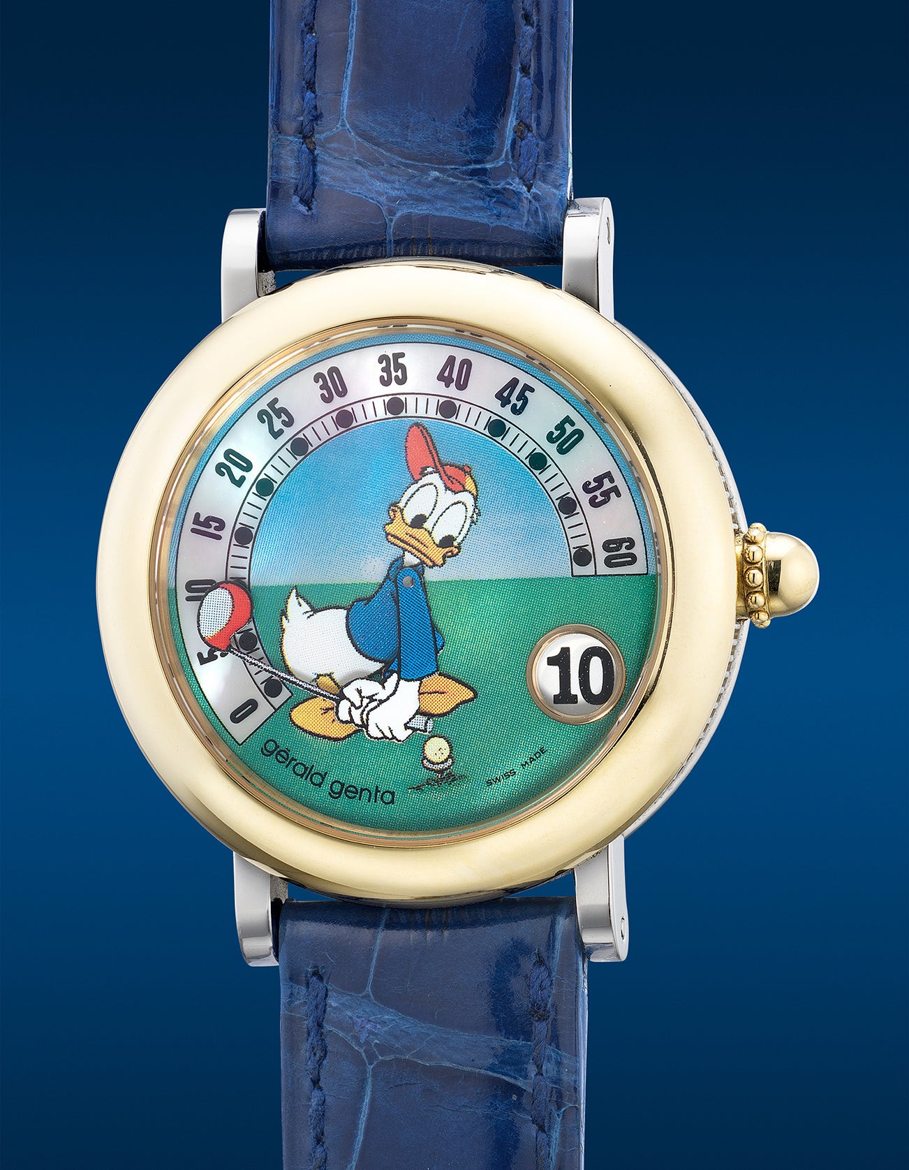 Part of the sought-after Retro Fantasy series, the present timepiece features the rarely seen Donald Duck dressed for a game of golf. An instant classic encompassing the whimsical duck swinging a golf club articulated as the indication of its retrograde style minutes. An aperture at the 4 o’clock position features a jumping hour sums up the style of the Genta Retro. With a teal colored dial contrasted against the mother-of-pearl minute track in the blue sky, the appeal is simply vibrant and playful. A delight to view as Donald Duck swings his golf club across the retrograde minute track, the hour jumps simultaneously once he hits the golf ball for a birdie. Preserved in excellent overall condition the present timepiece is cased in a rarely seen two-tone stainless steel and gold plated appeal, a must-have for collectors who already have the Mickey Mouse variant looking for his friends to complete the collection.
